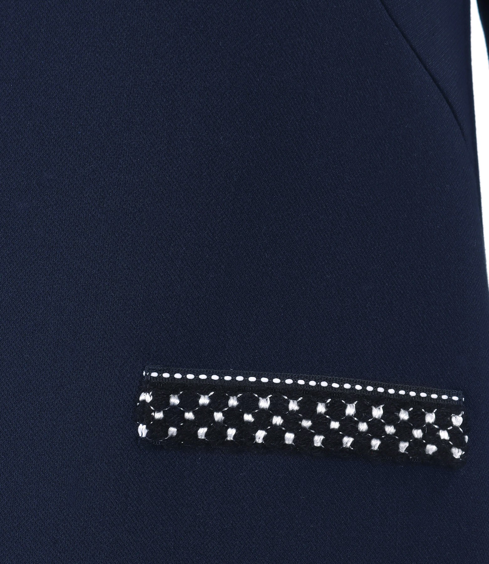 Rochie eleganta din stofa elastica groasa, captusita, in forma de A, accesorizata in contrast cu clape false, passepoil decolteu si maneci 3/4. Se inchide cu fermoar ascuns pe mijloc spate.