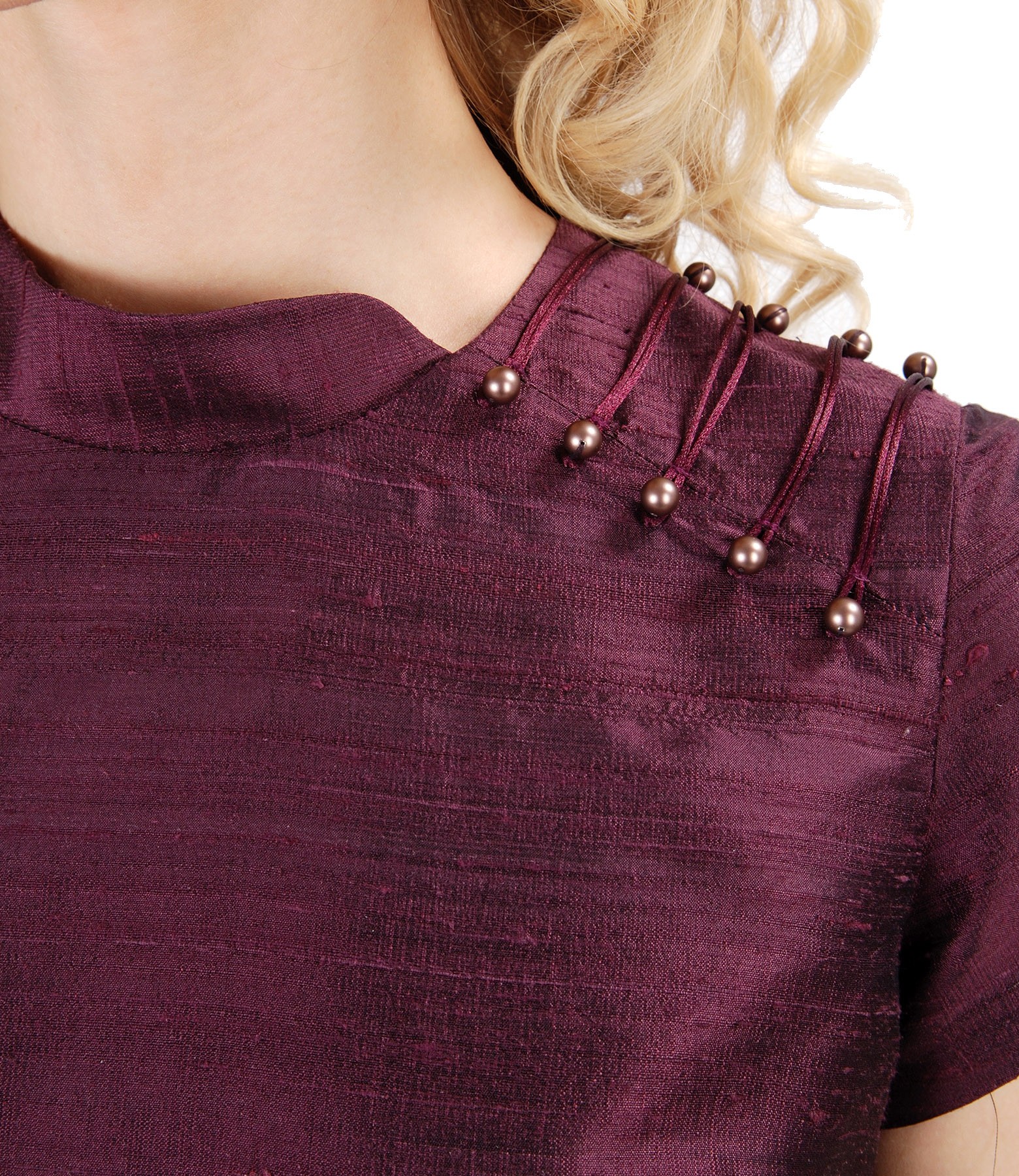 Rochie de seara din tafta de matase, captusita, cu guler gen tunica si fenta pe umarul stang inchisa cu 10 perle. Se inchide cu fermoar ascuns pe lateral stanga.