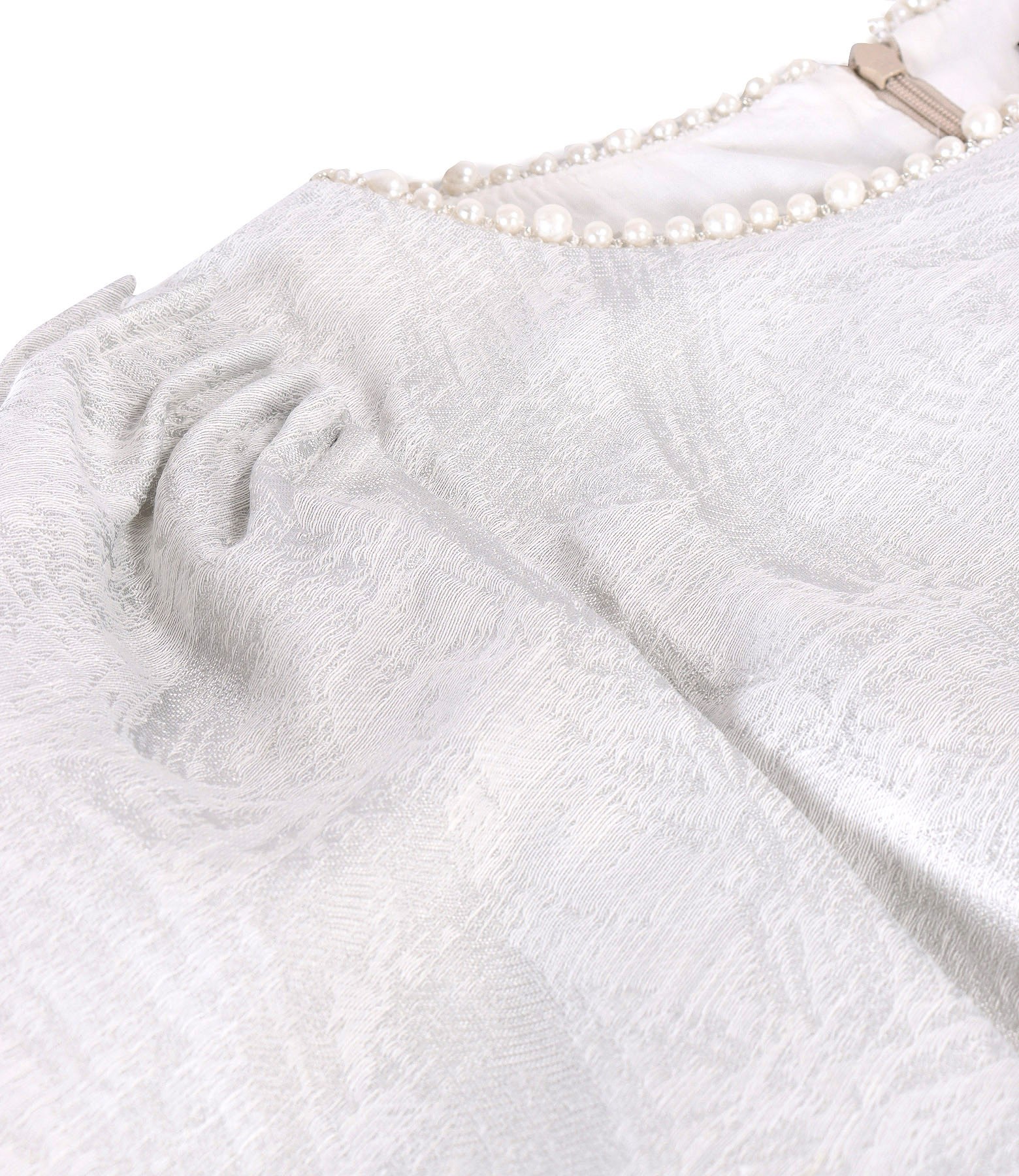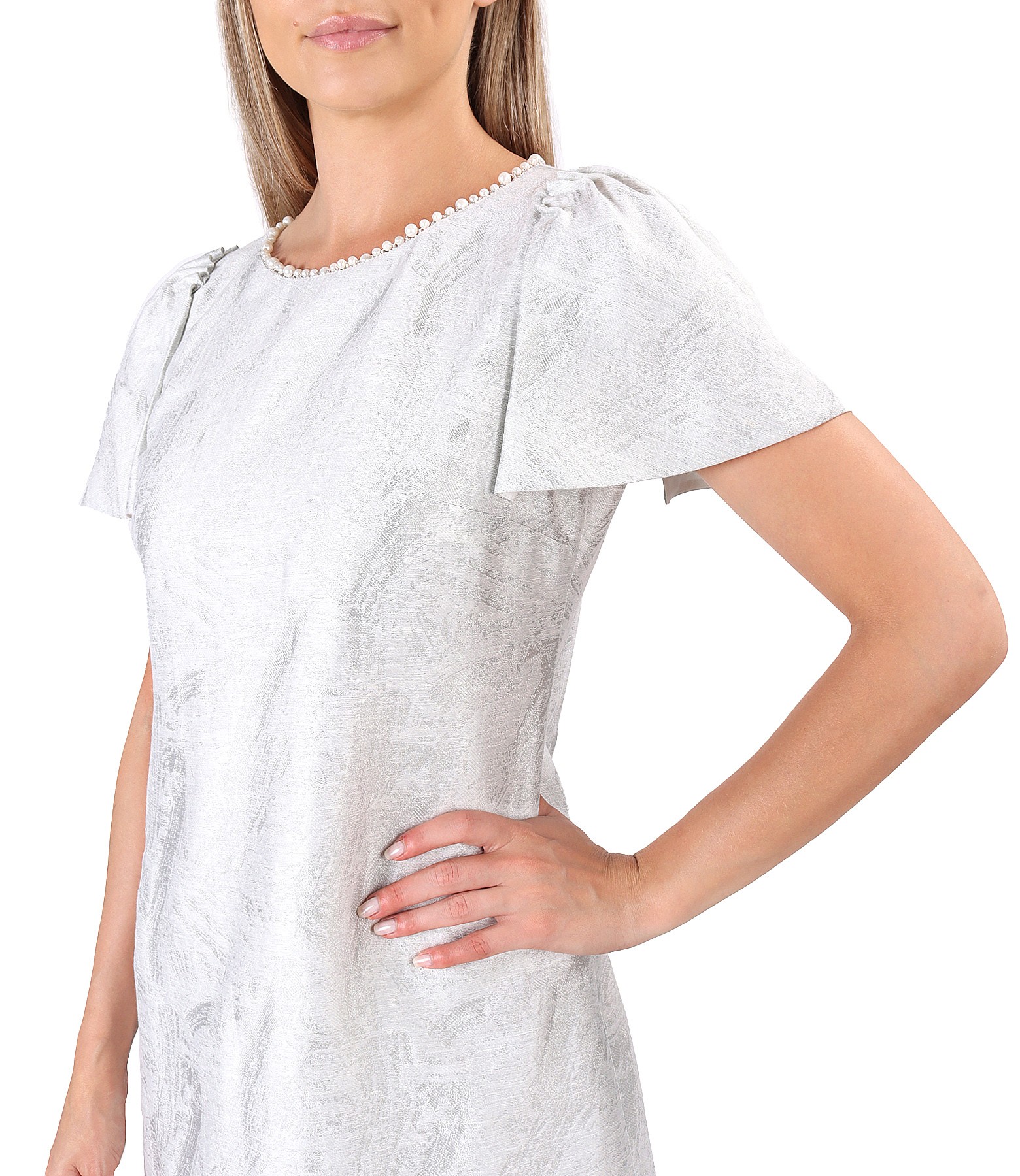 Rochie eleganta din tesatura brocata cu in cu aspect satinat, dublata cu viscoza, cu maneci scurte, ample si cu perle la decolteu. Se inchide cu fermoar ascuns pe mijloc spate.