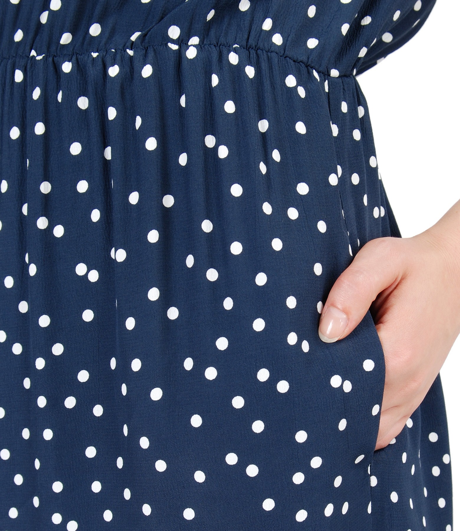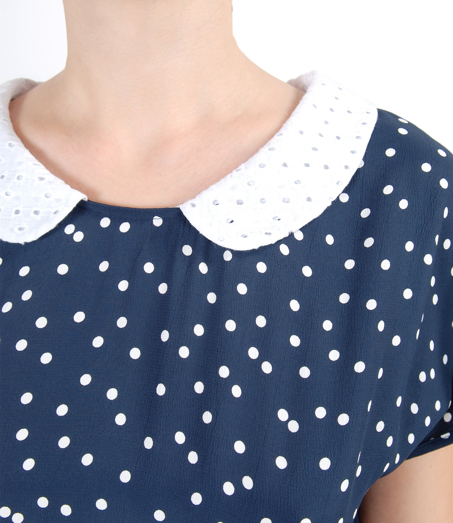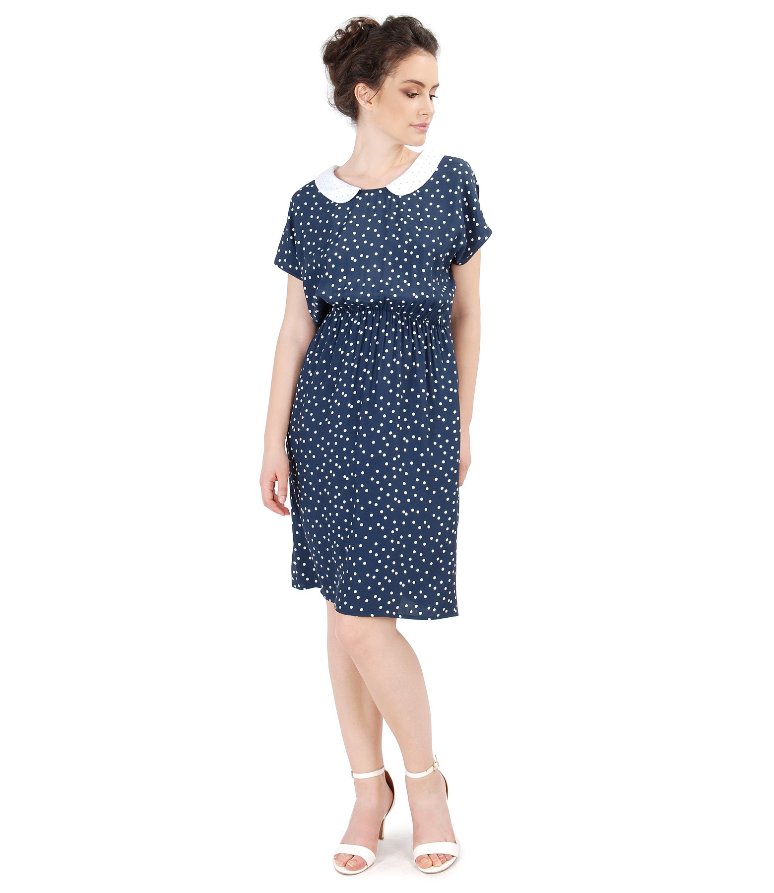 Rochie din viscoza imprimata cu picouri cu guler din tantela sparta din bumbac, necaptusita, cu decolteu rotund, talie incretita, buzunare ascunse laterale si guler rotund. Nu are sistem de inchidere.