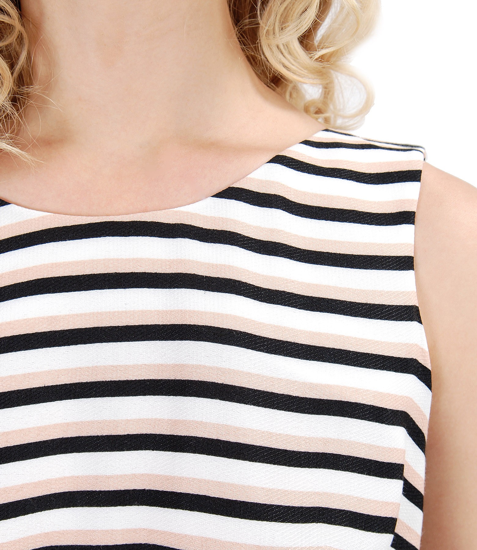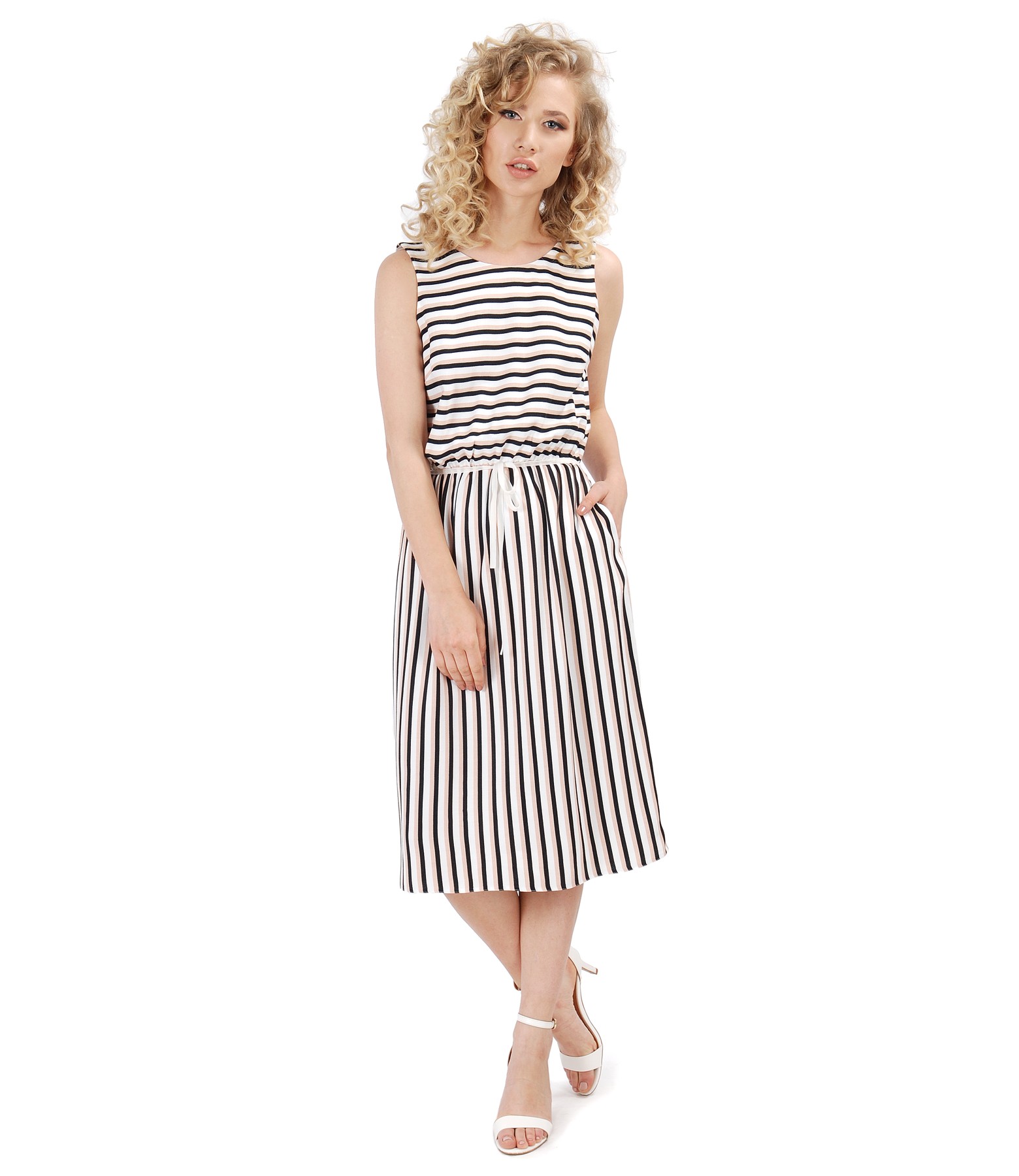 Rochie din viscoza imprimata cu dungi, necaptusita, cu buzunare laterale, decolteu rotund, elastic in talie si cordon din catifea crem. Nu are sistem de inchidere.