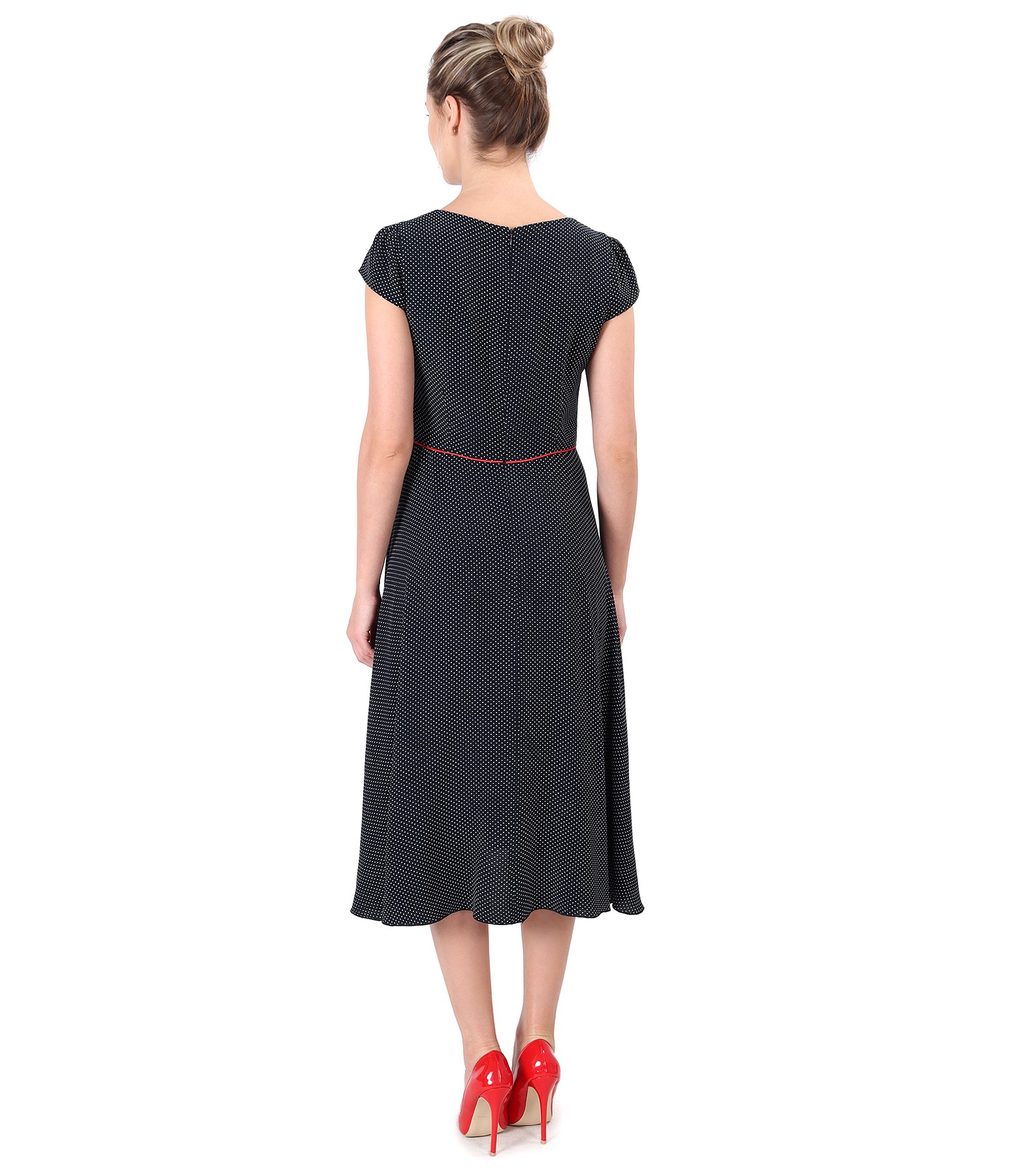Rochie din viscoza imprimata cu picouri, necaptusita, cu maneci scurte, si funda in talie. Se inchide cu fermoar ascuns pe mijloc spate.