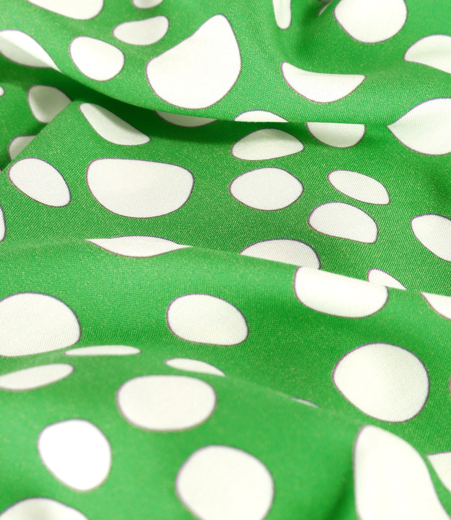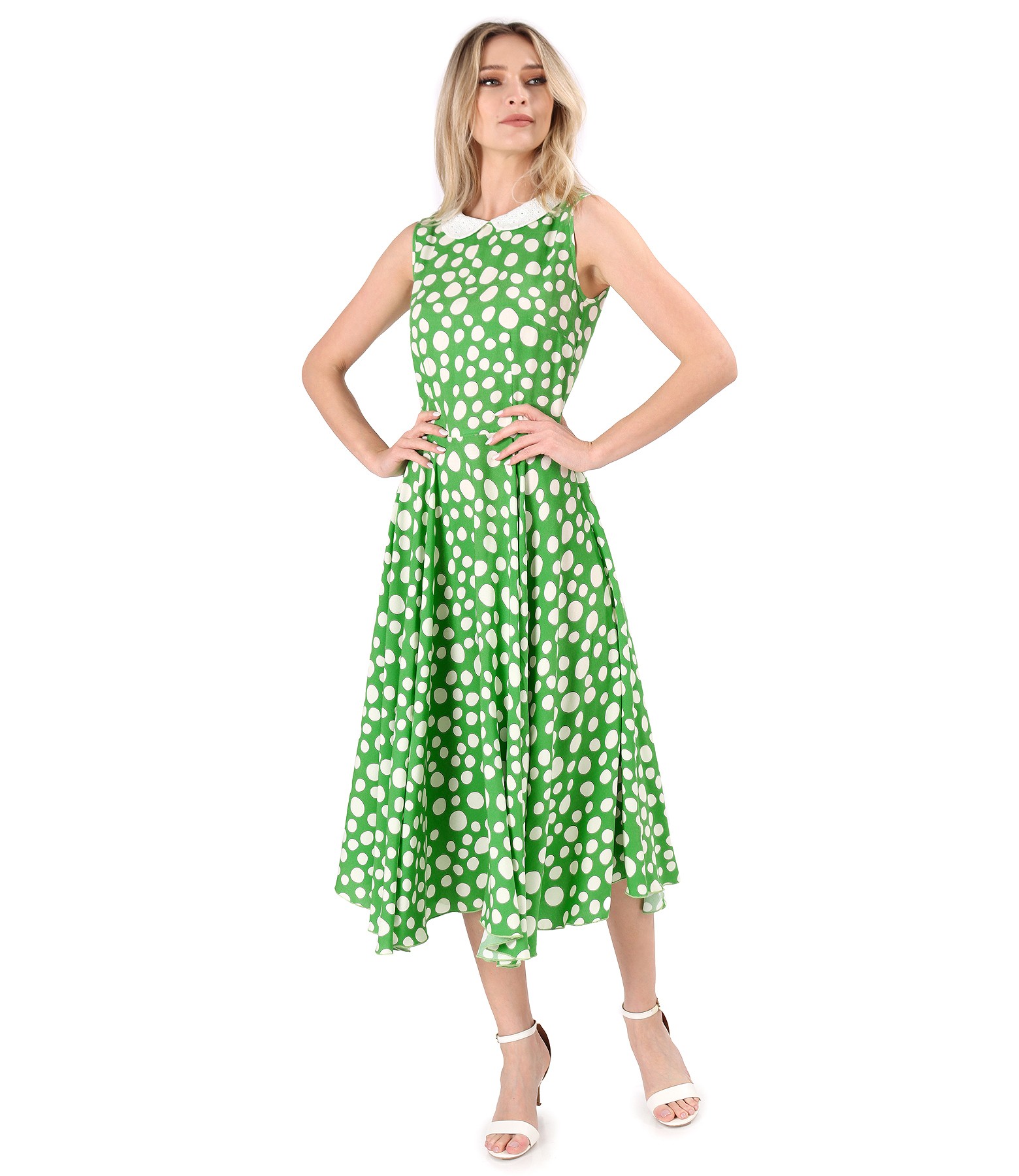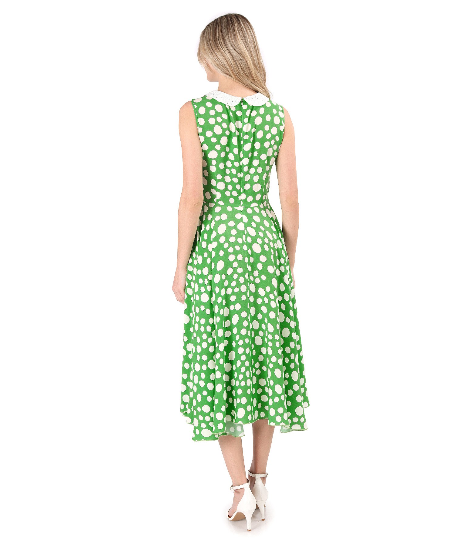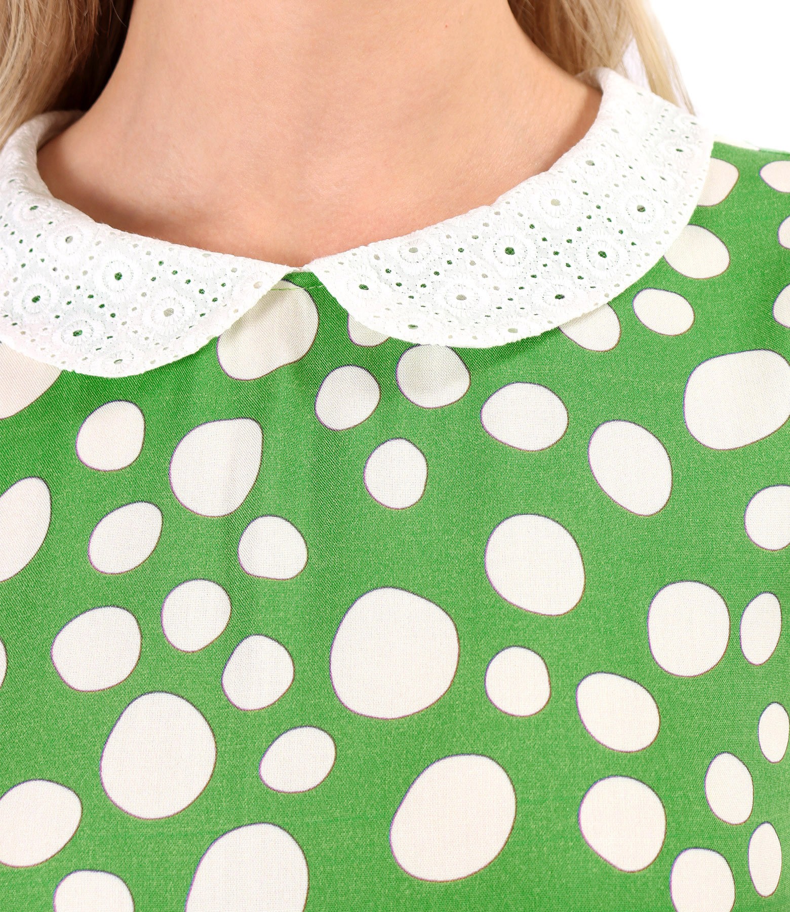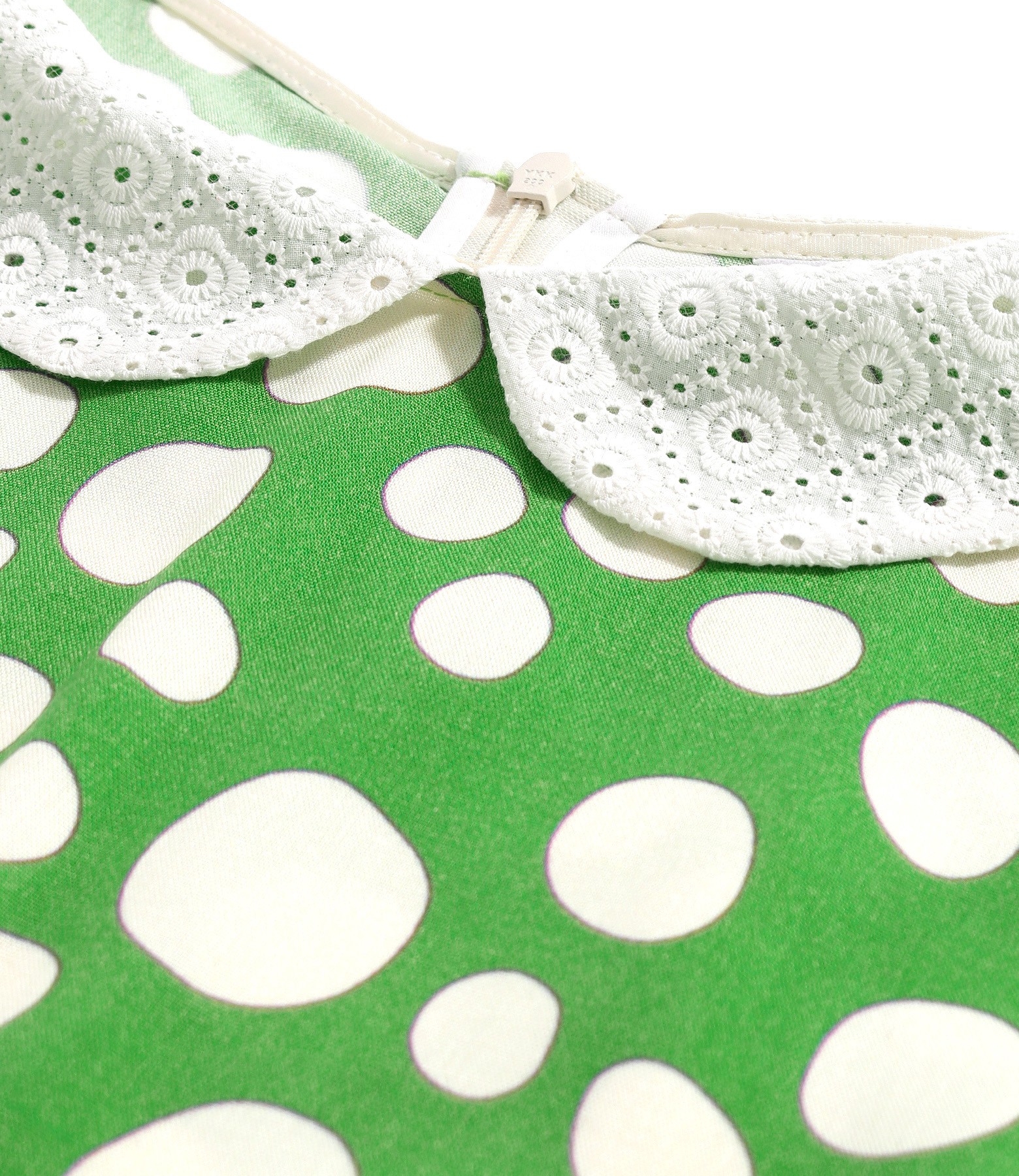 Rochie din viscoza imprimata cu buline, necaptusita, fara maneci si cu guler din dantela sparta. Se inchide cu fermoar ascuns pe mijloc spate.