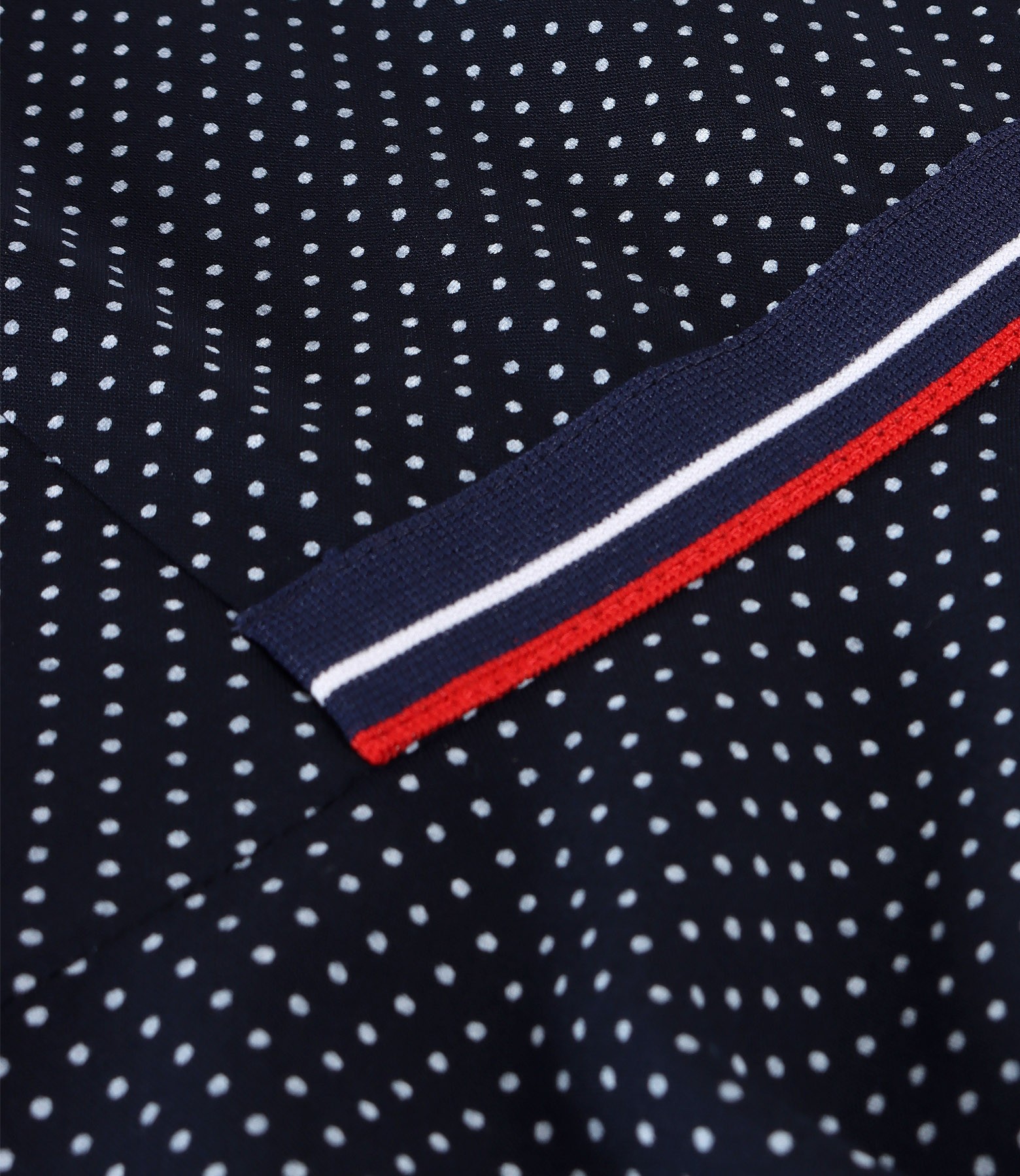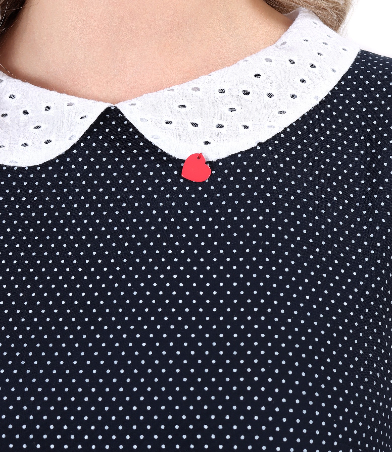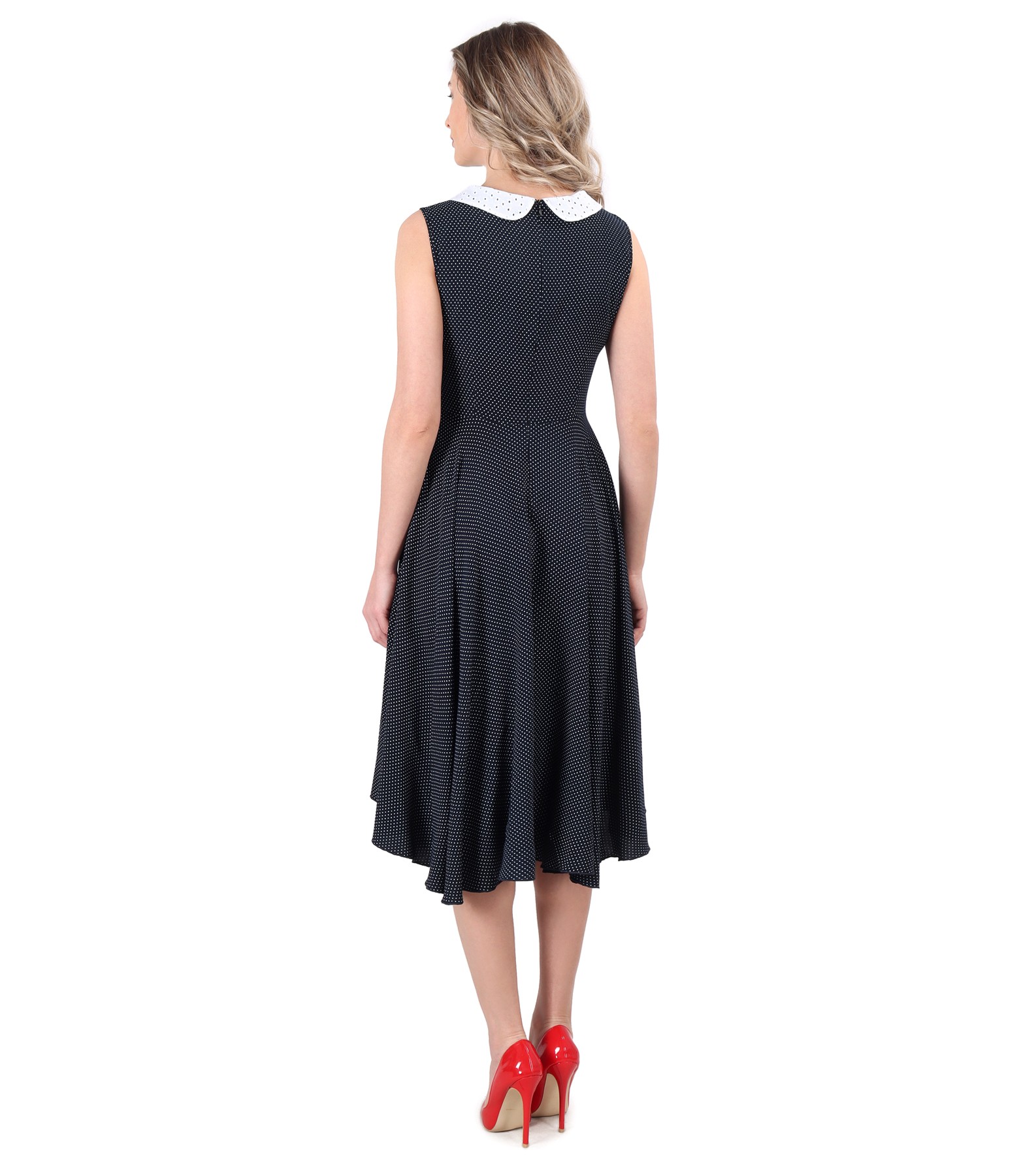 Rochie eleganta din viscoza imprimata cu picouri, necaptusita, fara maneci, cu guler din dantela sparta si elastic multicolor in talie. Se inchide cu fermoar ascuns pe mijloc spate.