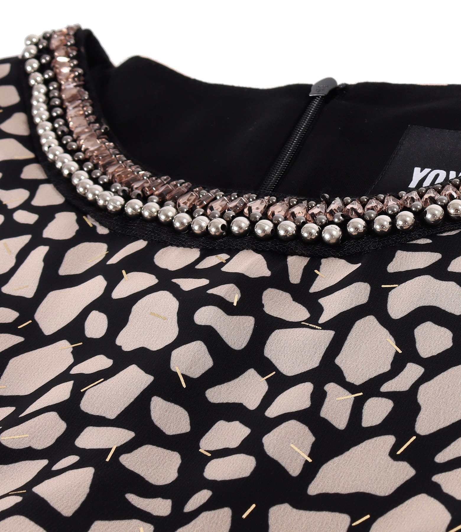 Rochie eleganta din voal cu animal print, dublata cu viscoza, cu maneci scurte si pasmanterie la decolteu. Se inchide cu fermoar ascuns pe mijloc spate.