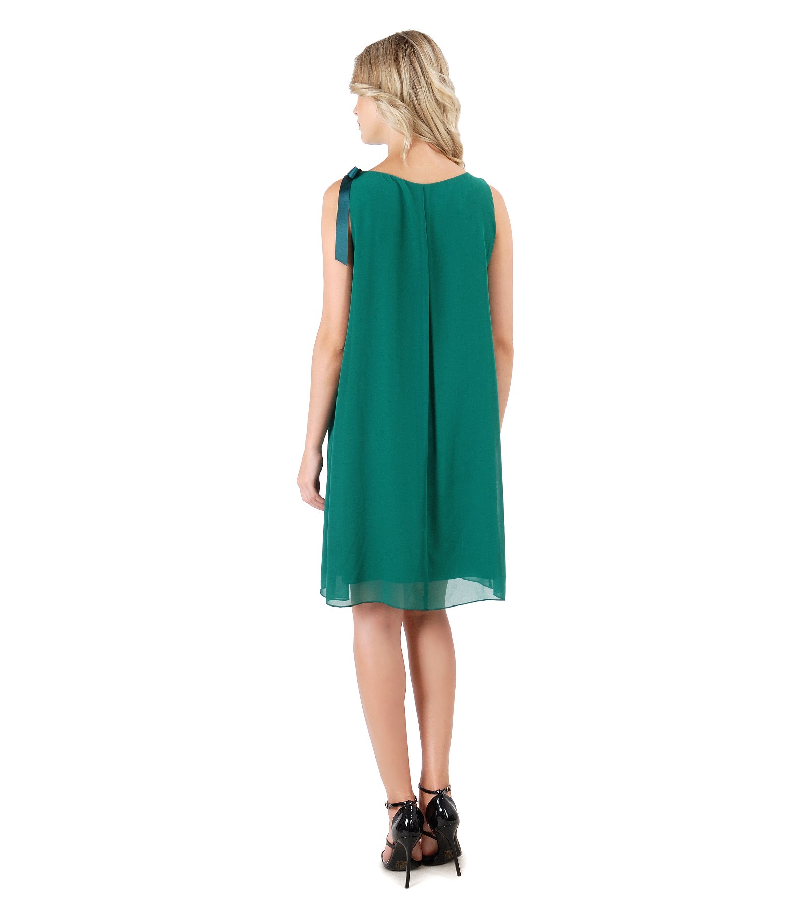 Rochie lejera din voal, captusita cu viscoza, fara maneci, cu falduri pe fata, cristale pe decolteu si funda detasabila de rips fixata pe umar. Nu are sistem de inchidere.