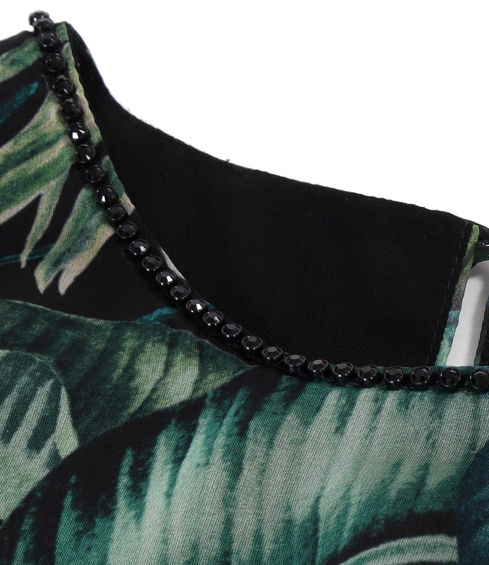 Rochie din voal imprimat cu motive florale, dublata cu viscoza, cu maneci scurte, decolteu rotund si aplicatie de cristale la decolteu. Se inchide cu un nasture si cu fermoar pe mijloc spate.