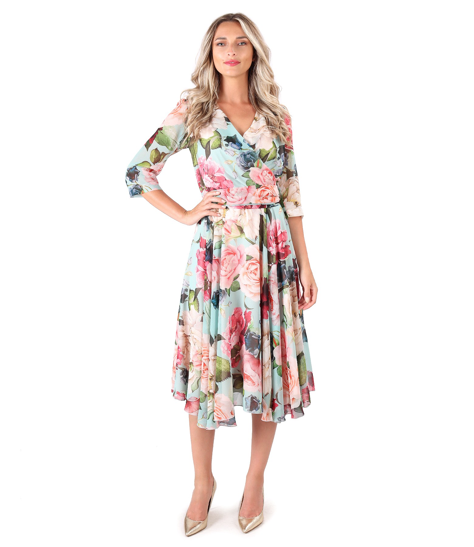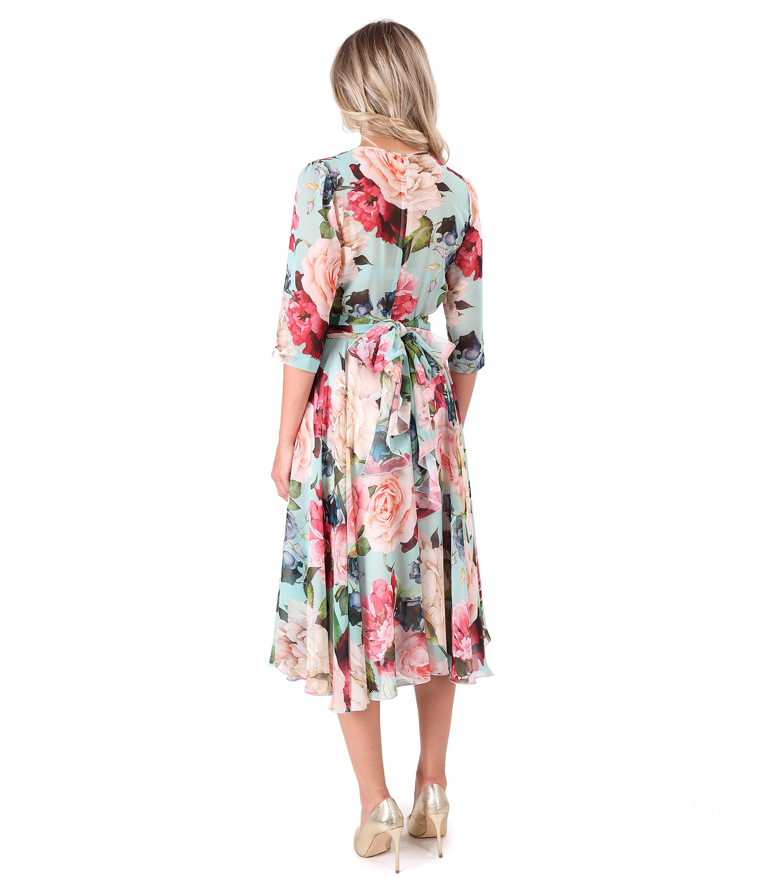 Rochie din voal imprimat cu motive florale, captusita cu viscoza, cu cordon esarfa detasabila, cu maneci 3/4 si pieptii petrecuti. Se inchide cu fermoar ascuns pe mijloc spate.