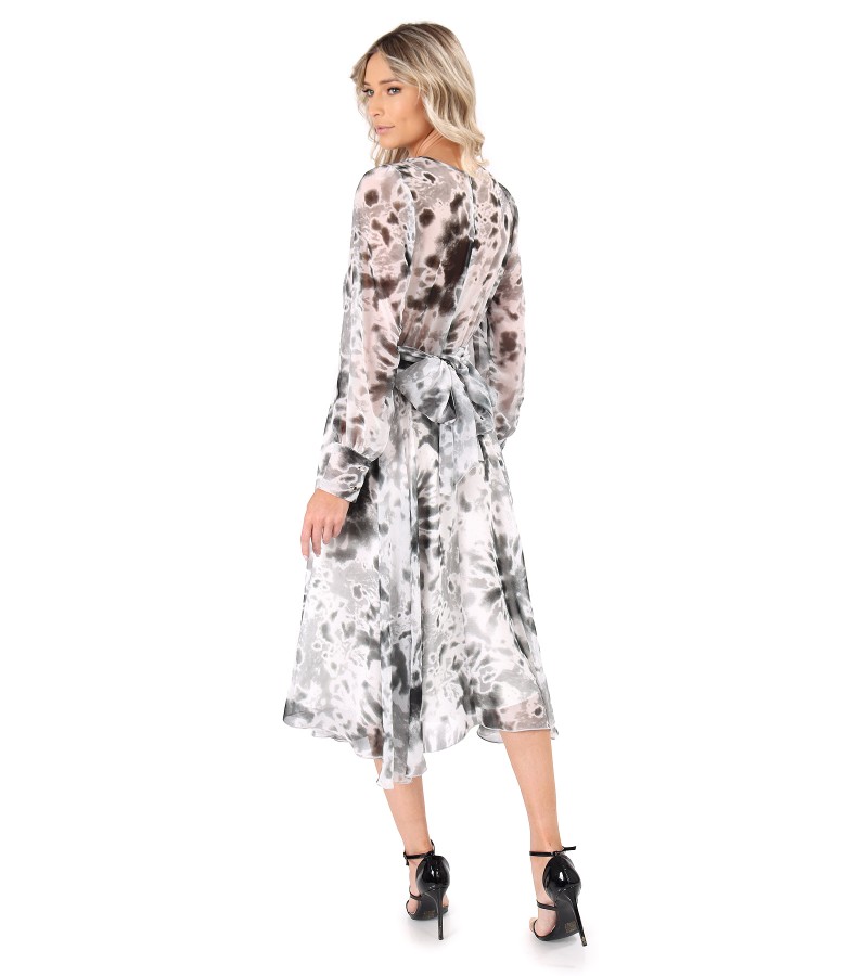 Rochie eleganta din voal imprimat cu brosa detasabila in talie, captusita cu viscoza, cu maneci lungi incretite la terminatie cu mansete cu doi nasturi si pieptii petrecuti.