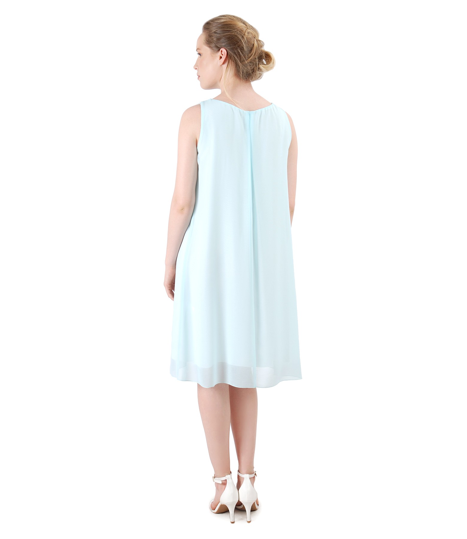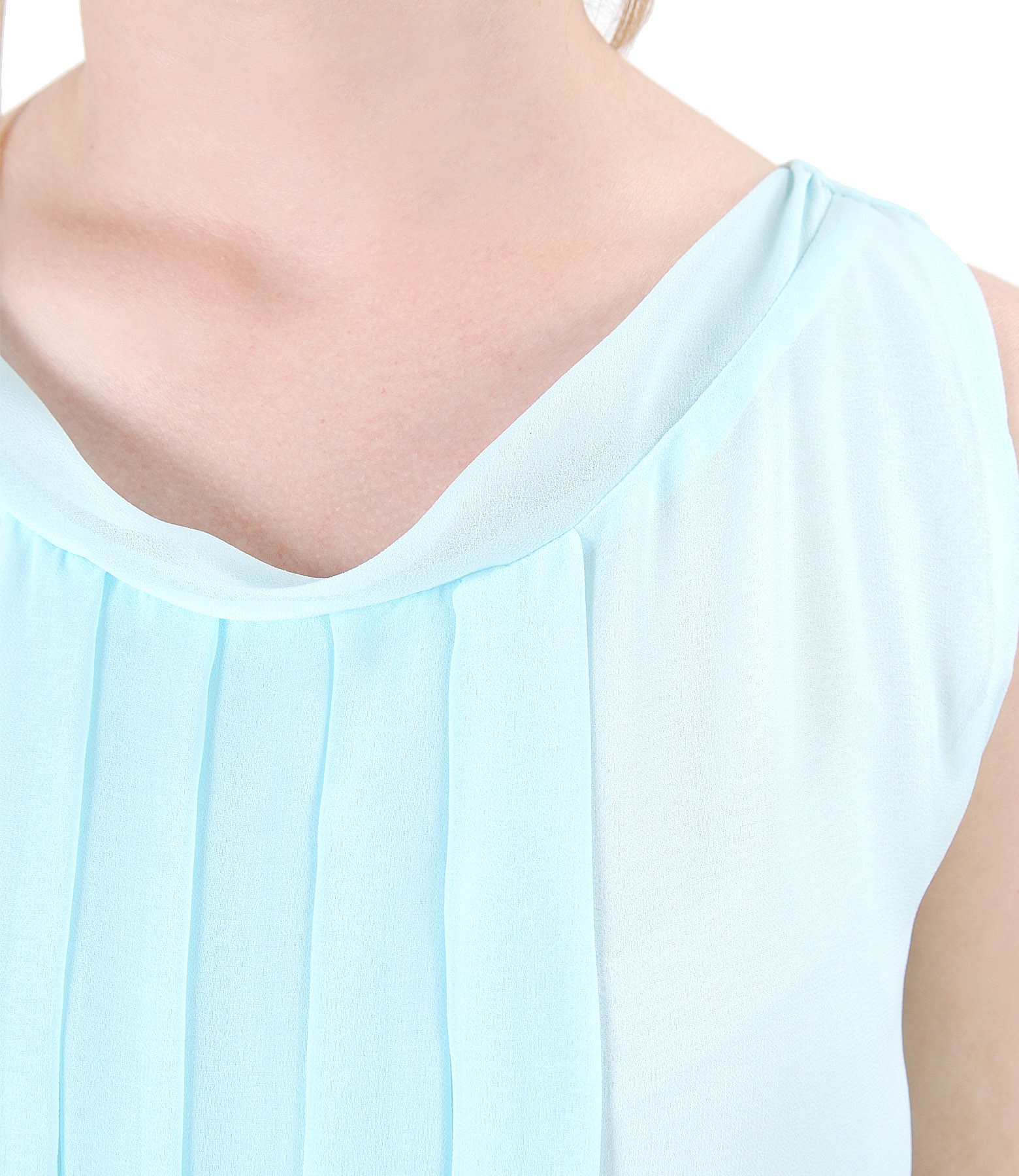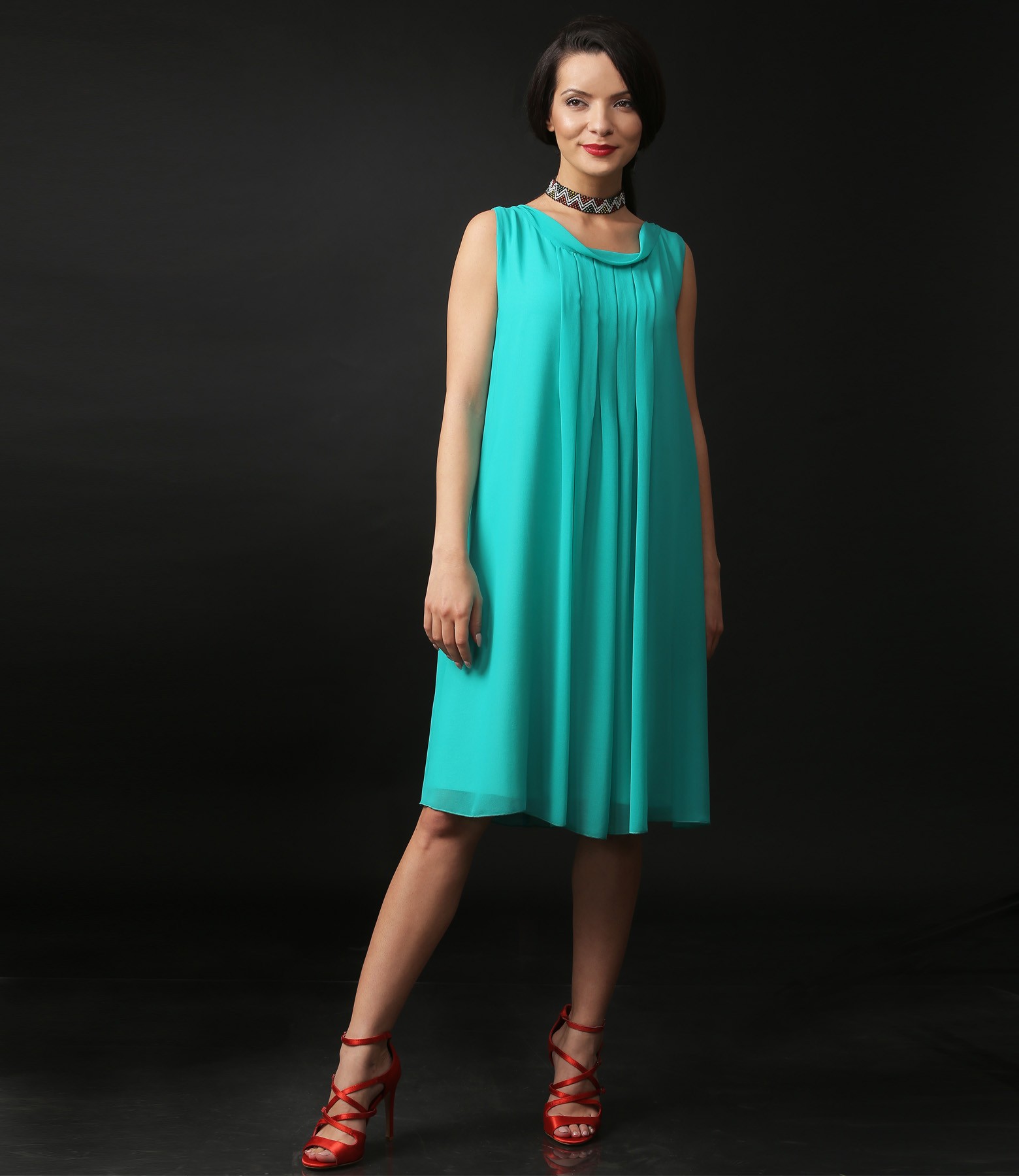 Rochie lejera din voal, fara maneci, cu falduri pe fata si garnitura pe decolteu.