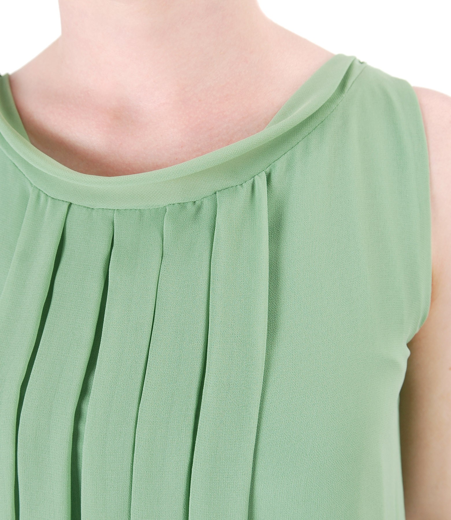 Rochie lejera din voal, fara maneci, cu falduri pe fata si garnitura pe decolteu. Nu are sistem de inchidere.