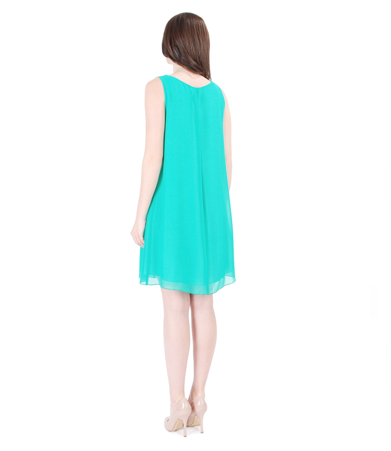 Rochie lejera din voal, fara maneci, cu falduri pe fata si garnitura pe decolteu. Nu are sistem de inchidere.
