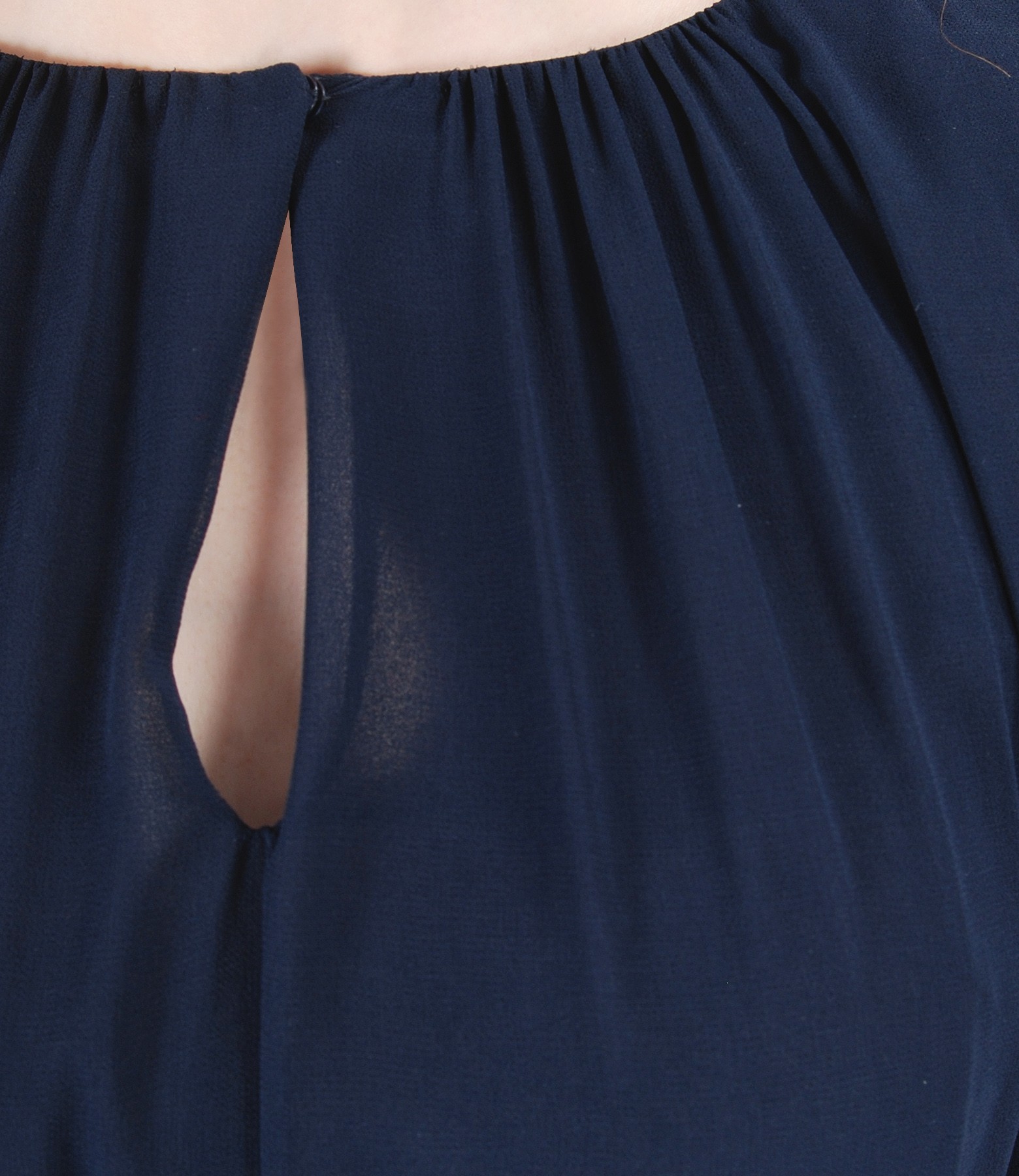 Rochie din voal, dublata, cu decolteu rotund cu fenta inchisa cu o capsa, cu talia elasticizata si falduri fata si spate. Se strange cu un cordon detasabil in talie.