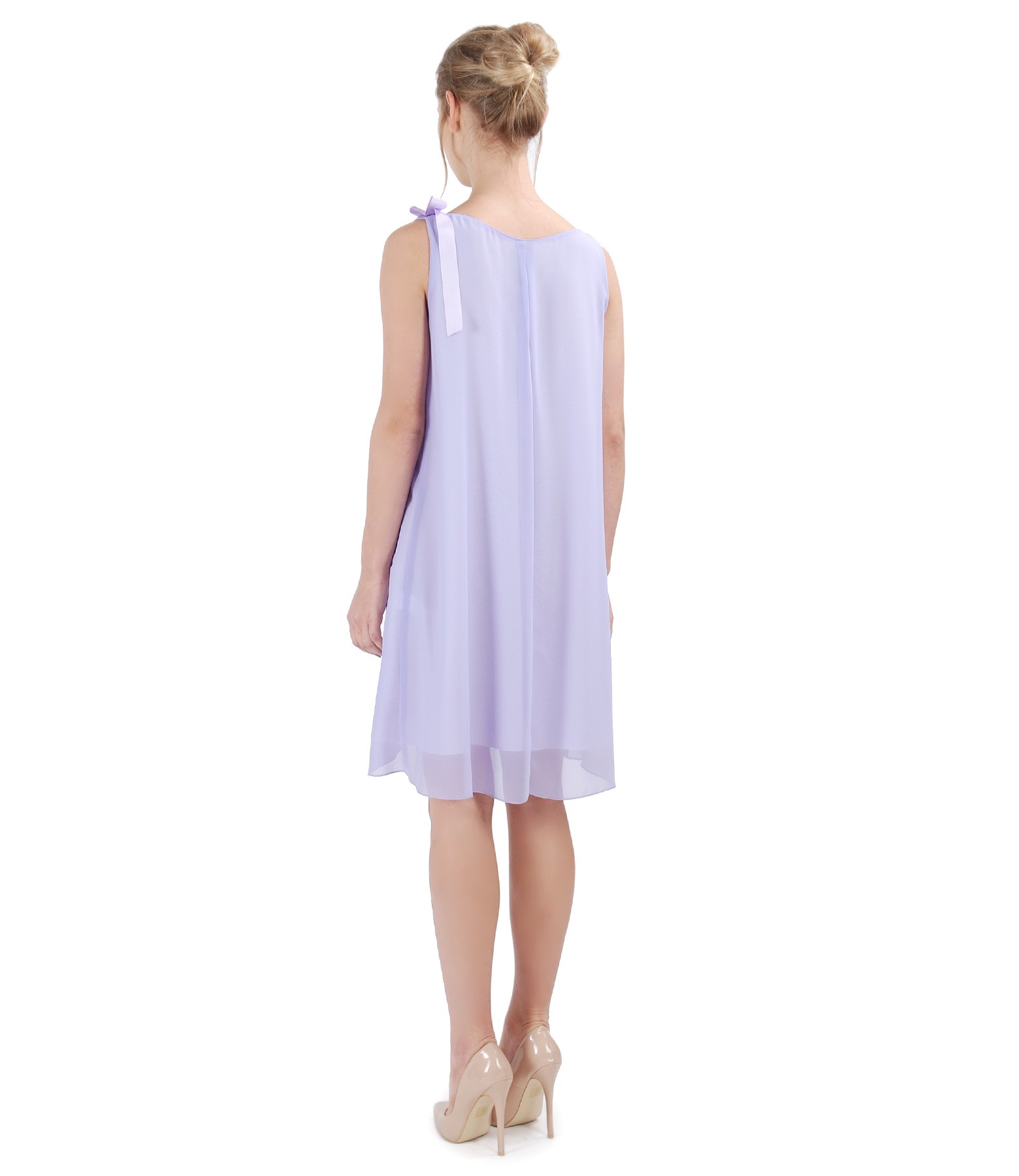 Rochie lejera din voal, captusita cu viscoza, fara maneci, cu falduri pe fata, cristale pe decolteu si funda detasabila de rips fixata pe umar.