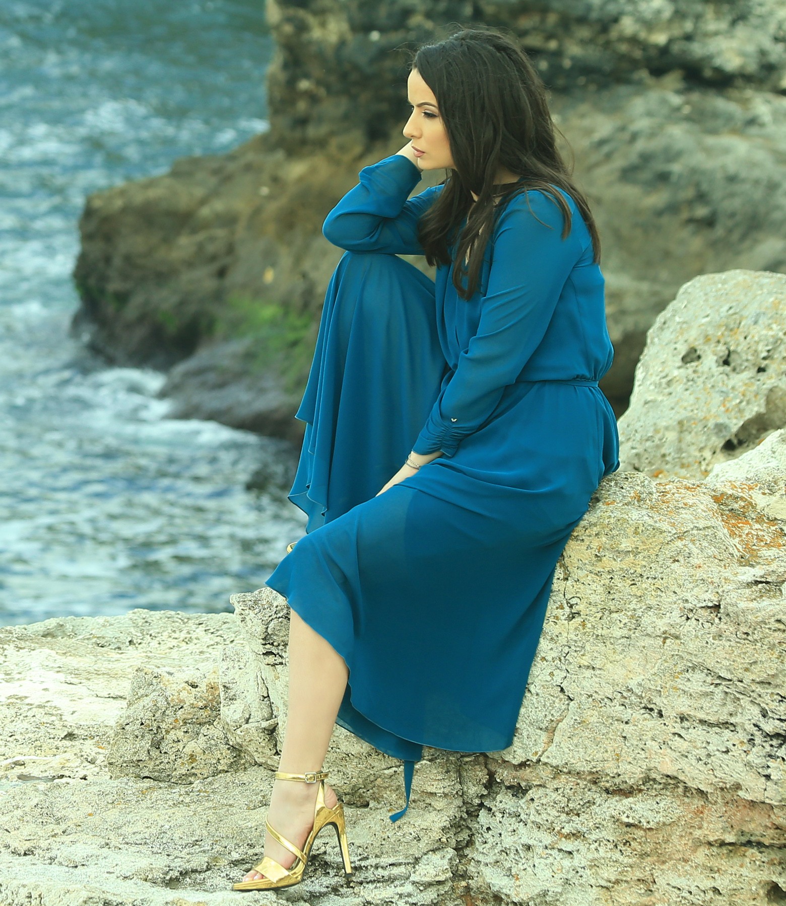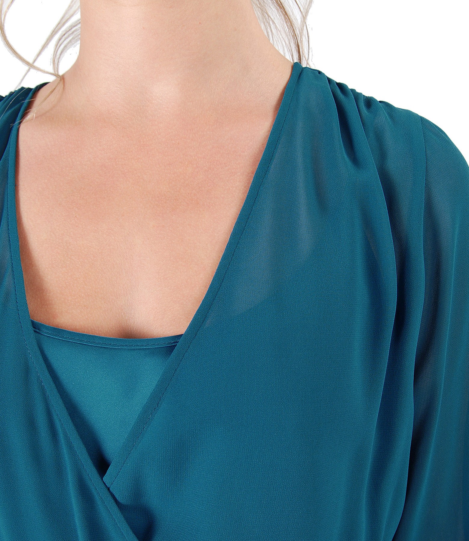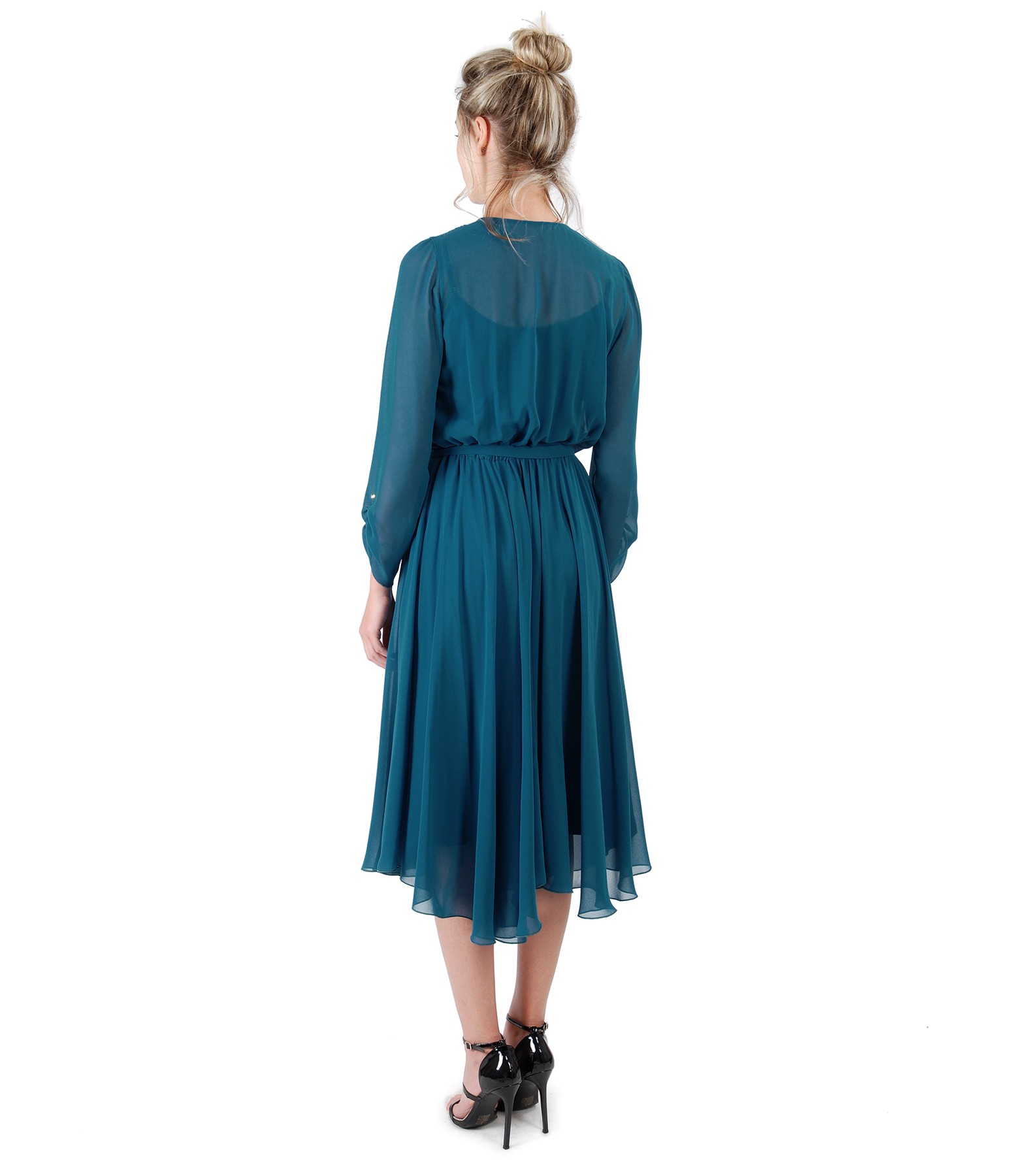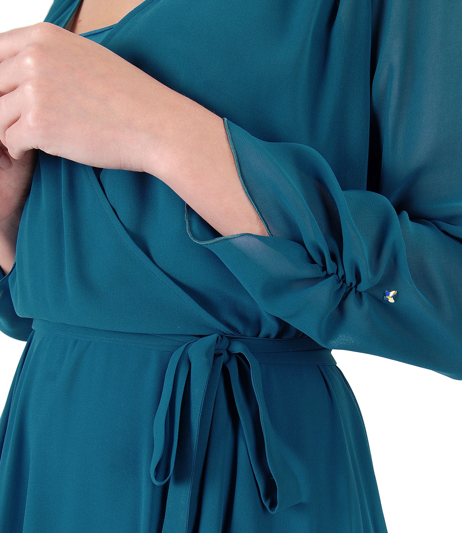 Rochie din voal uni, cu furou din saten, pieptii petrecuti, elastic in talie si maneci 3/4 cu aplicatie de cristale la terminatie maneci.