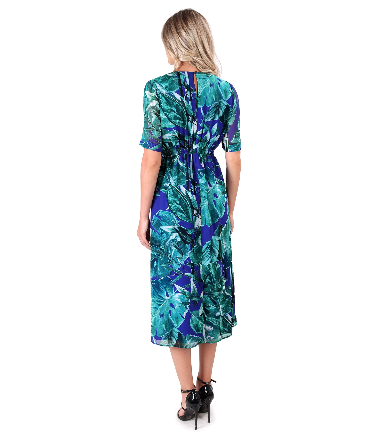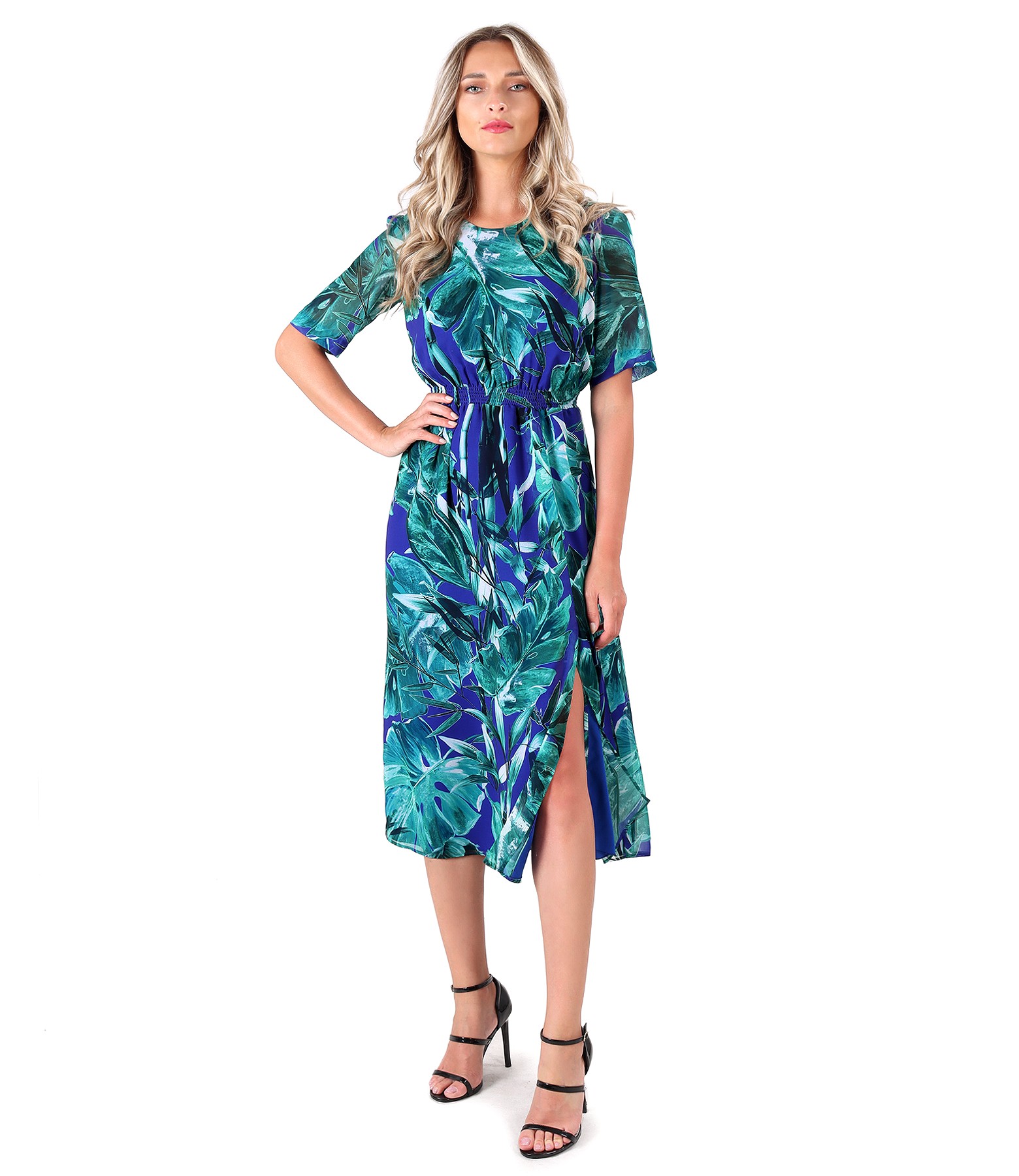 Rochie din voal imprimat cu motive florale, dublata cu viscoza, cu maneci scurte, decolteu rotund elastic in talie si cu slit pe fata.