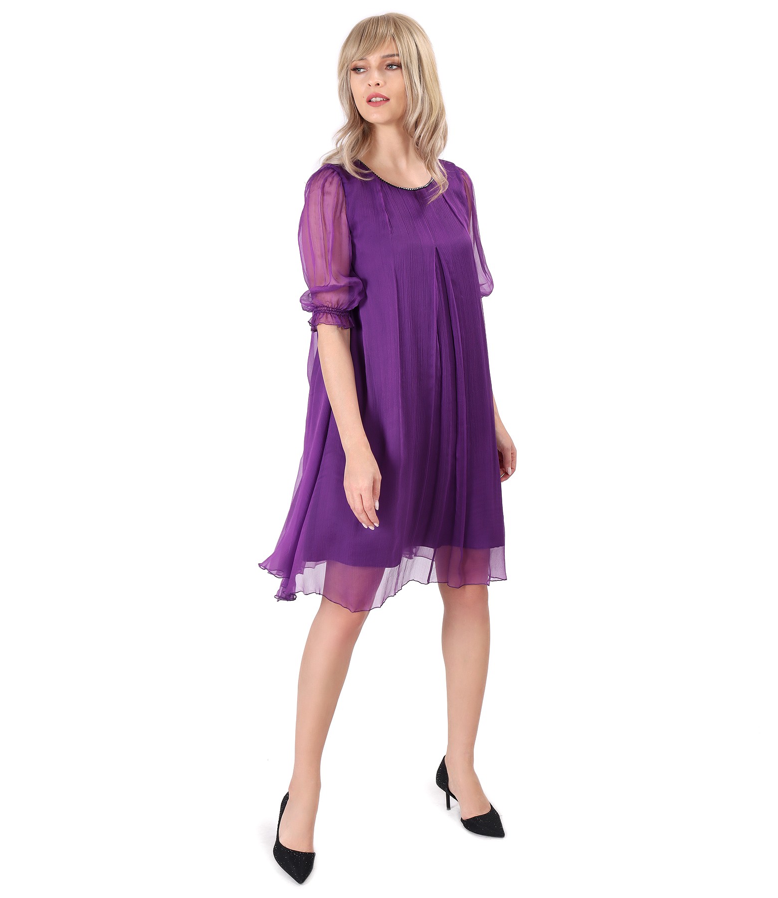Rochie evazata din voal de matase naturala, dublata cu saten, cu maneci ¾ si aplicatie de cristale pe decolteul rotund. Se inchide cu un nasture pe spate.