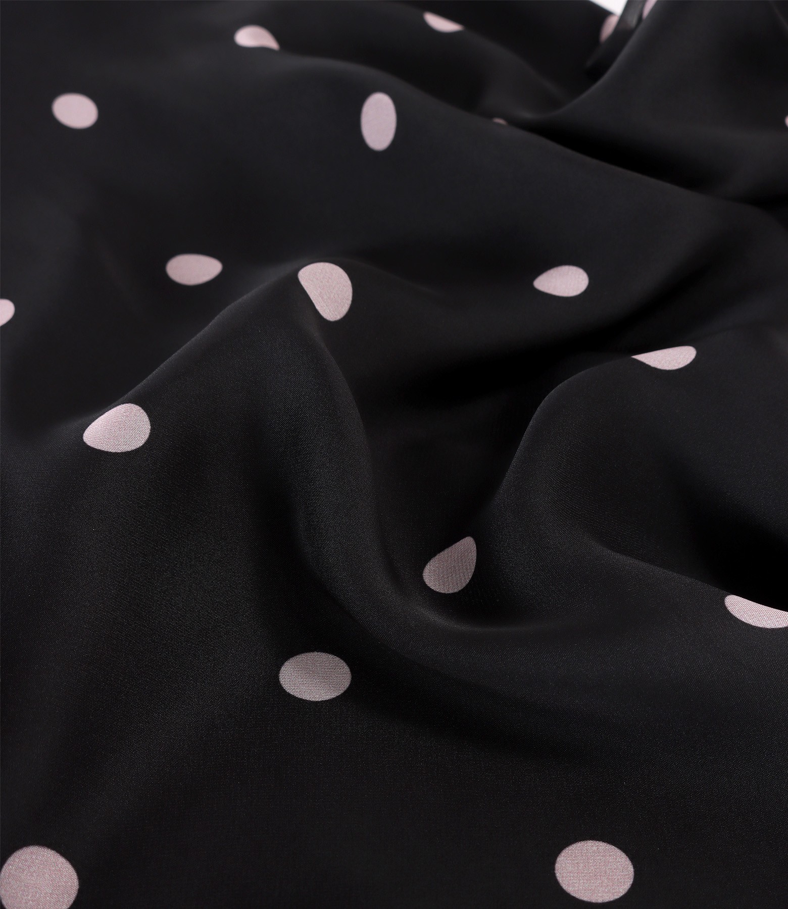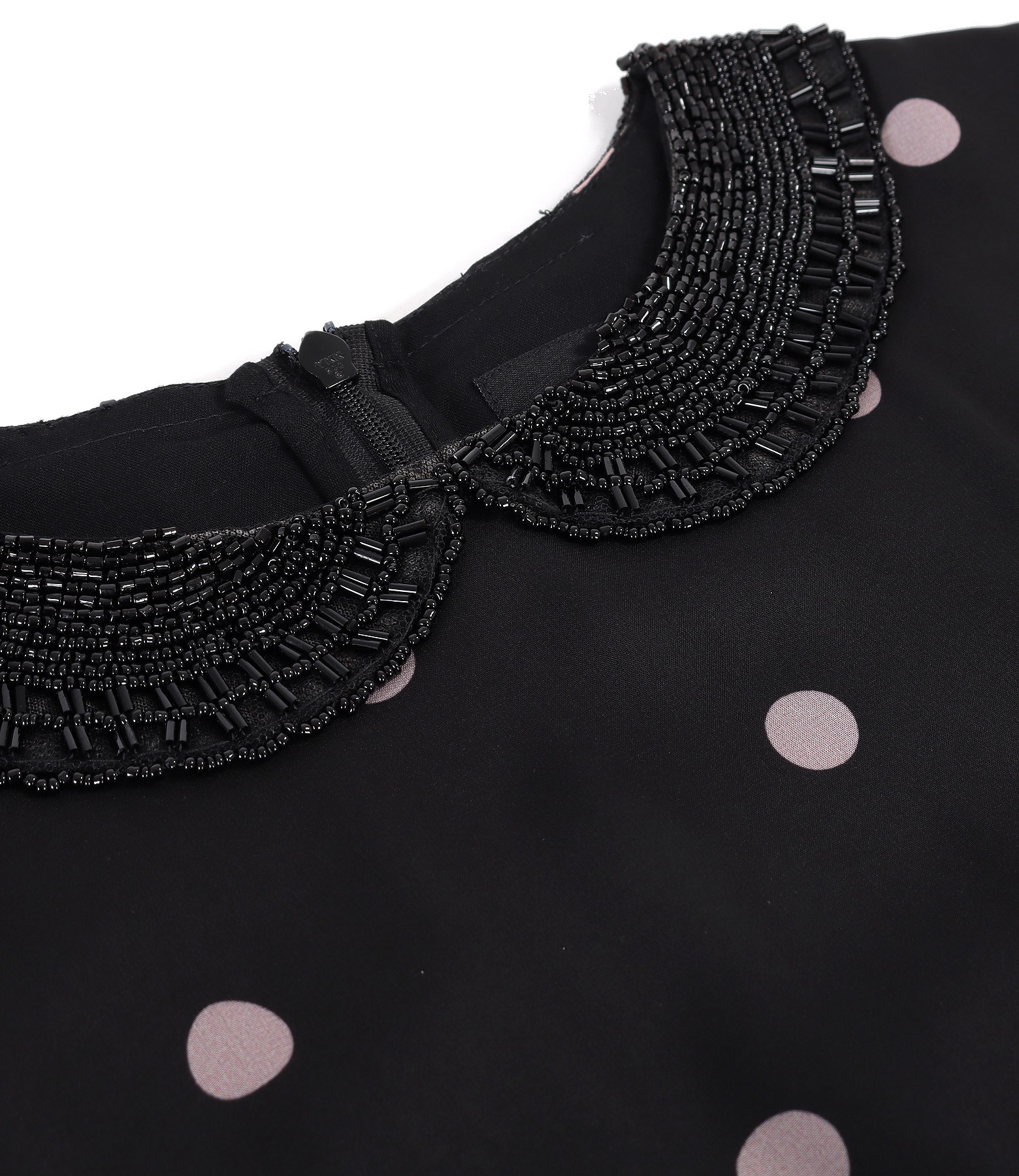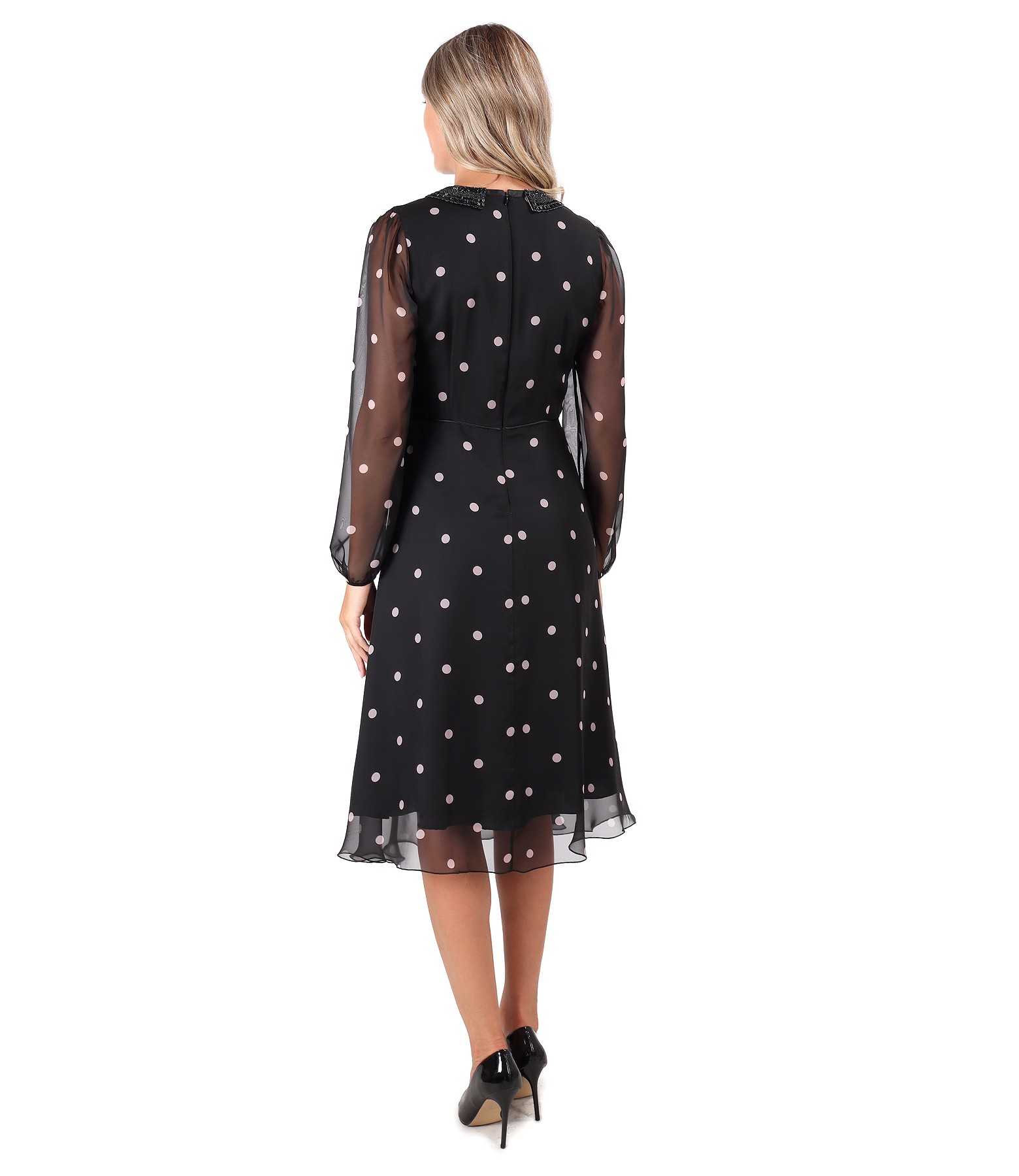 Rochie din voal imprimat cu buline, dublata cu viscoza, cu maneci lungi cu elastic la terminatie si guler rotund cu margele. Se inchide cu fermoar ascuns pe mijloc spate.