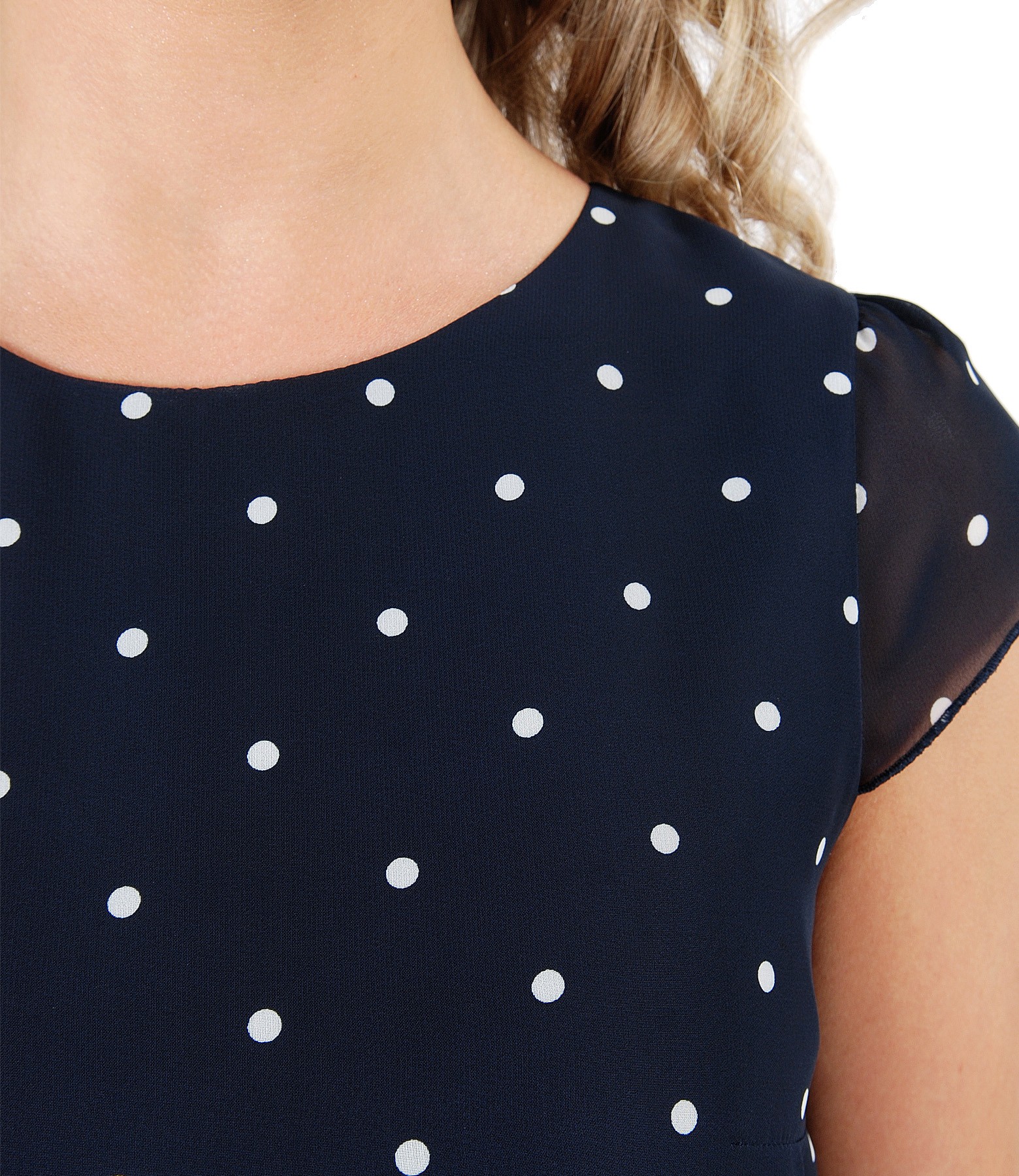 Rochie din voal imprimat cu bulin, dublata cu viscoza, cu maneci scurte si decolteu rotund. Se inchide cu un nasture si cu fermoar pe mijloc spate.