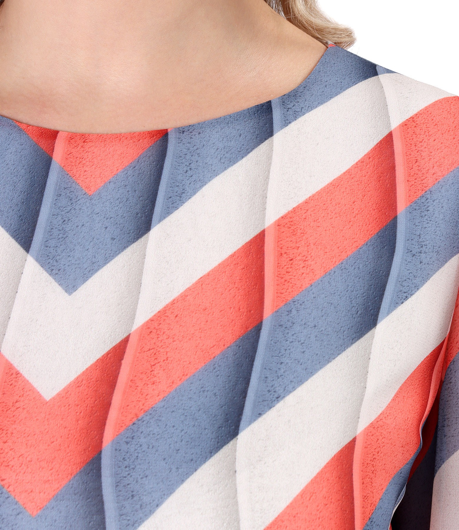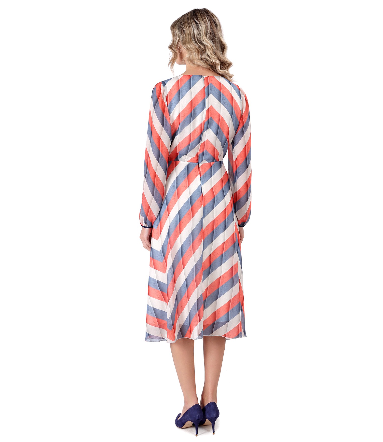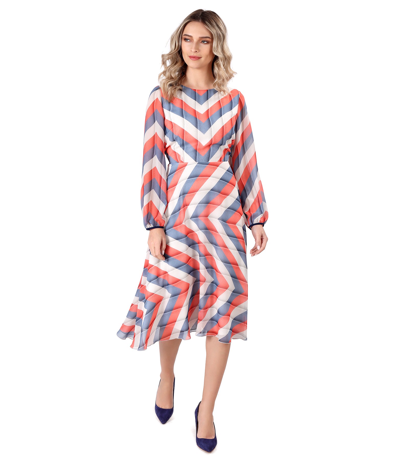 Rochie din voal imprimat cu dungi, dublata cu viscoza, cu maneci lungi cu elastic la terminatie. Se inchide cu fermoar ascuns pe mijloc spate.