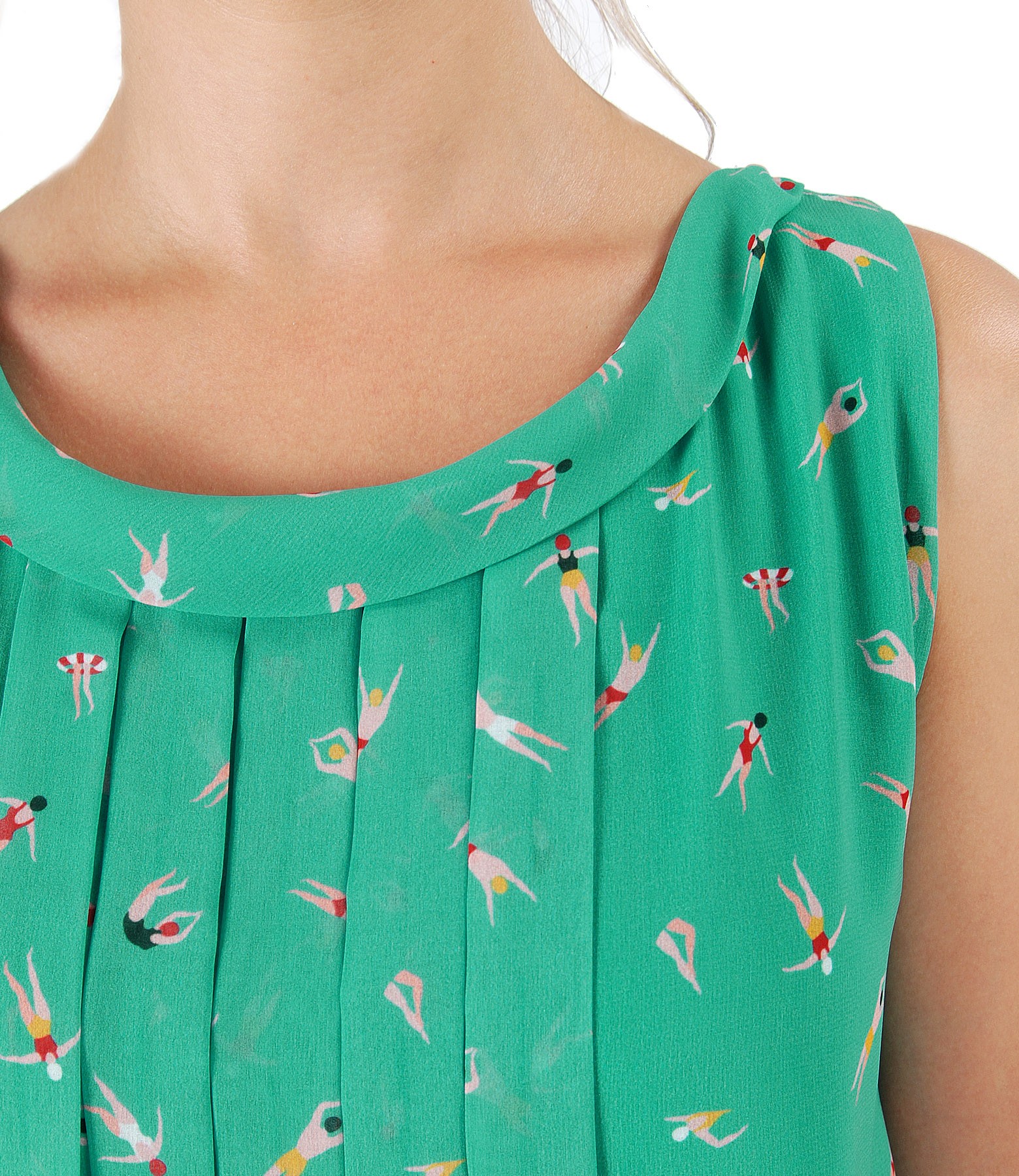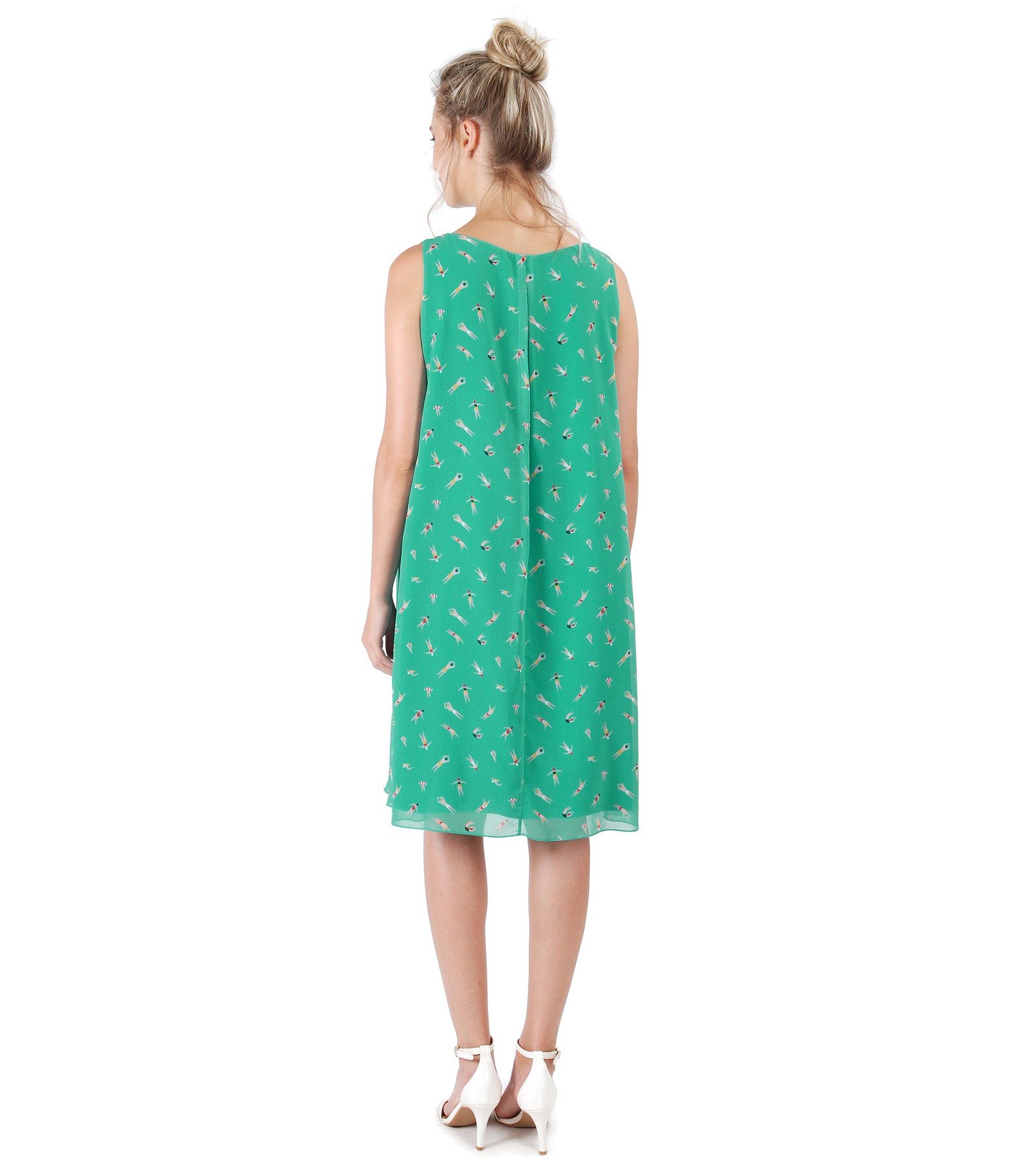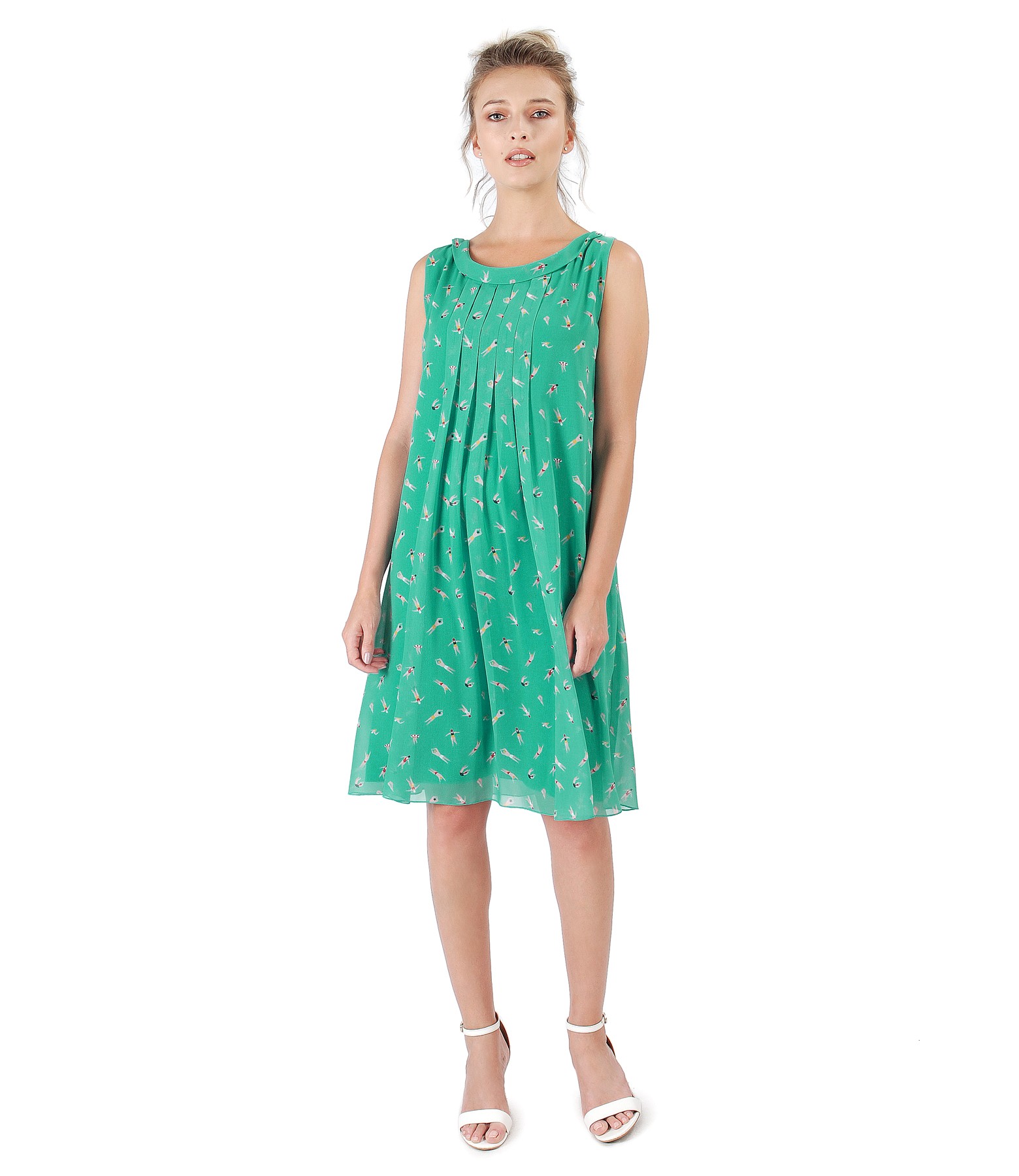 Rochie lejera din voal imprimat, dublata cu viscoza, fara maneci, cu falduri pe fata si garnitura pe decolteu.