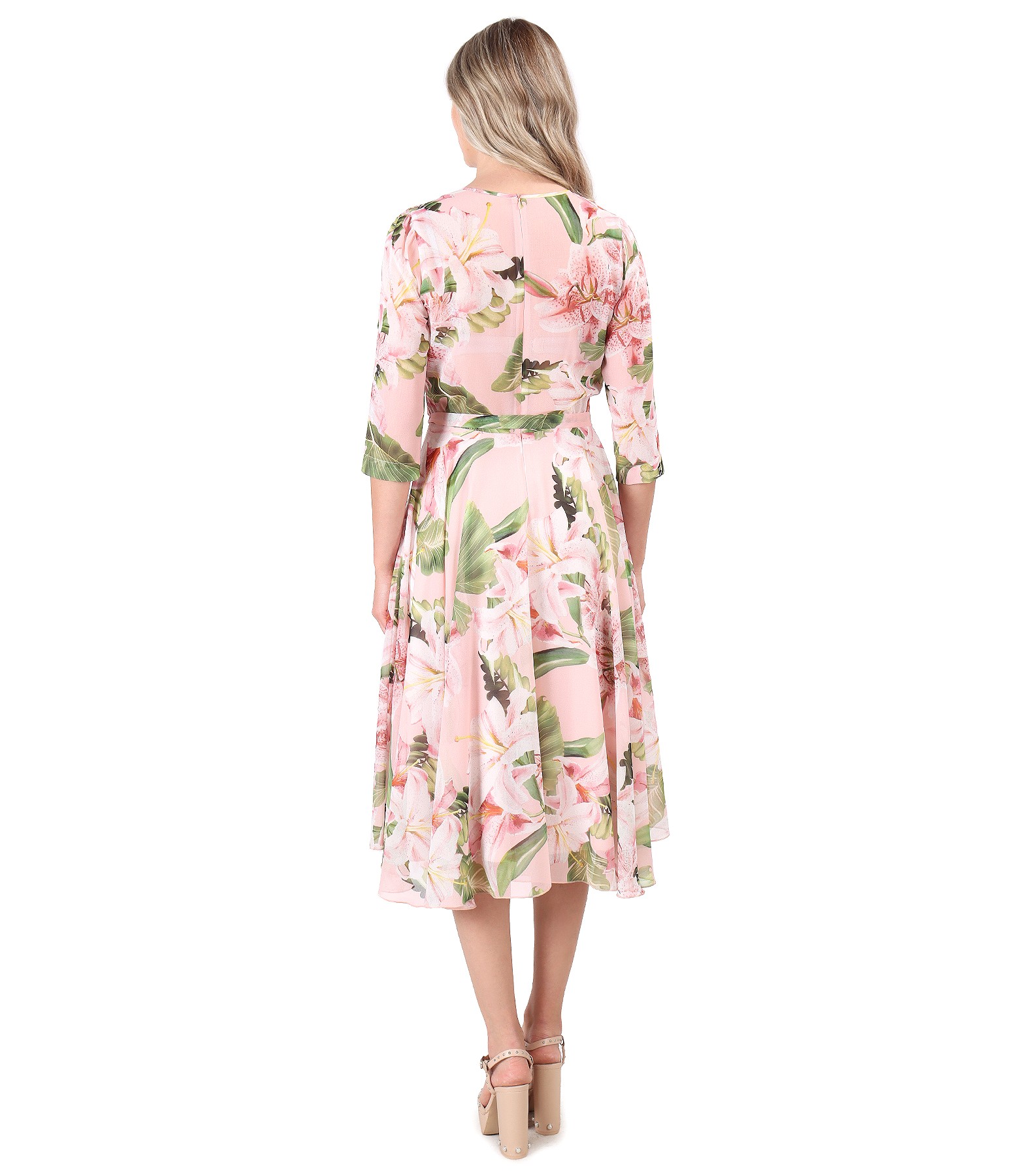 Rochie din voal imprimat cu flori supradimensionate, captusita cu viscoza, cu cordon in talie, cu maneci 3/4 si pieptii petrecuti. Se inchide cu fermoar ascuns pe mijloc spate. La marimile mari XL-3XL, spatele este dublat.