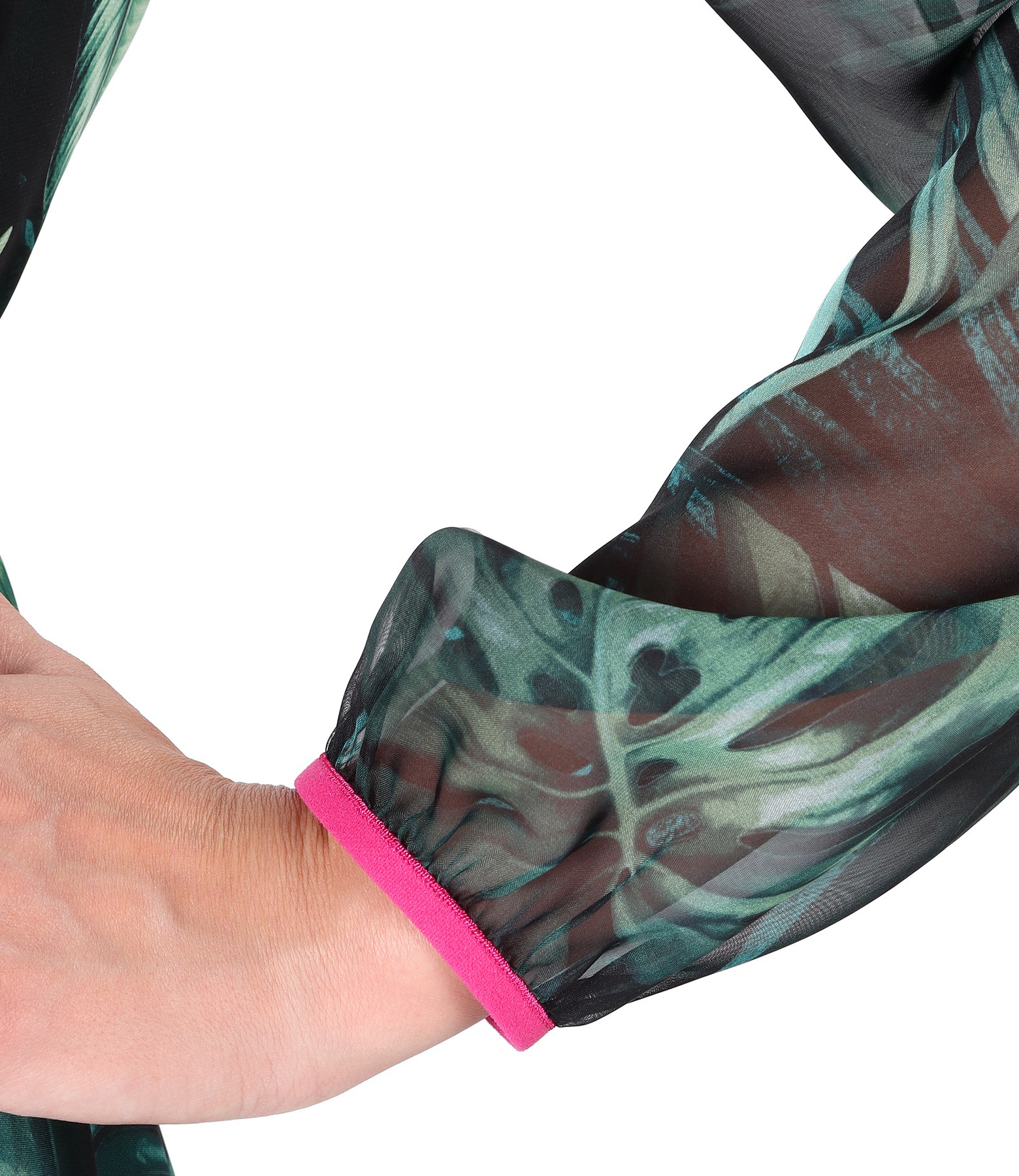 Rochie din voal imprimat cu motive florale, dublata cu viscoza, cu maneci lungi cu elastic la terminatie, decolteu rotund si banda din rips cu brosa in talie. Se inchide cu fermoar ascuns pe mijloc spate.