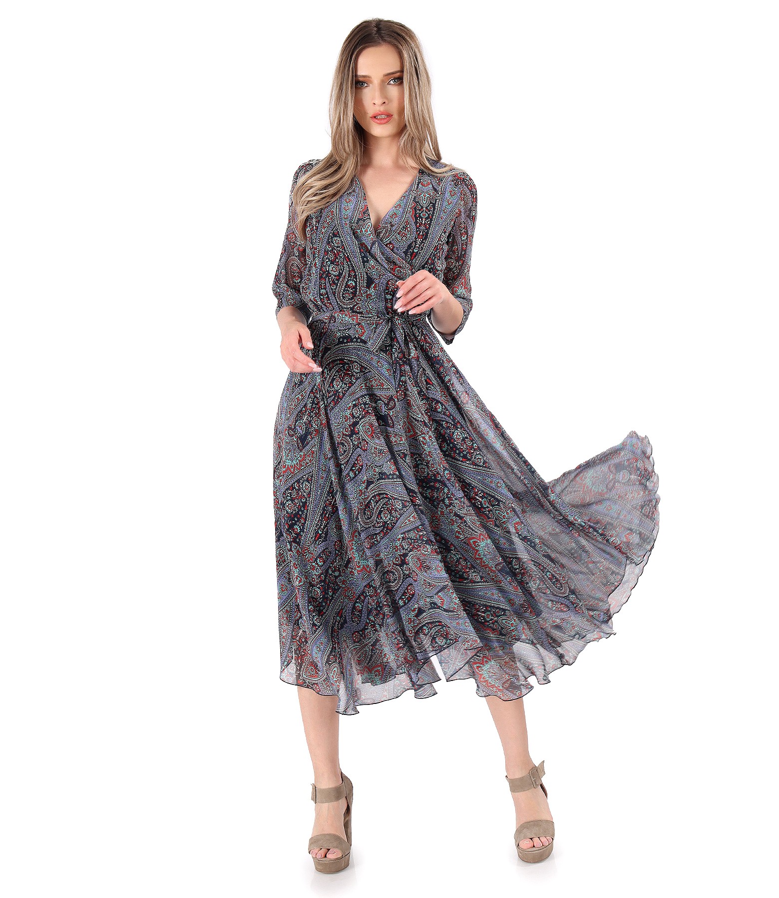 Rochie din voal imprimat cu motive paisley, captusita cu viscoza, cu cordon in talie, cu maneci 3/4 si pieptii petrecuti. Se inchide cu fermoar ascuns pe mijloc spate.