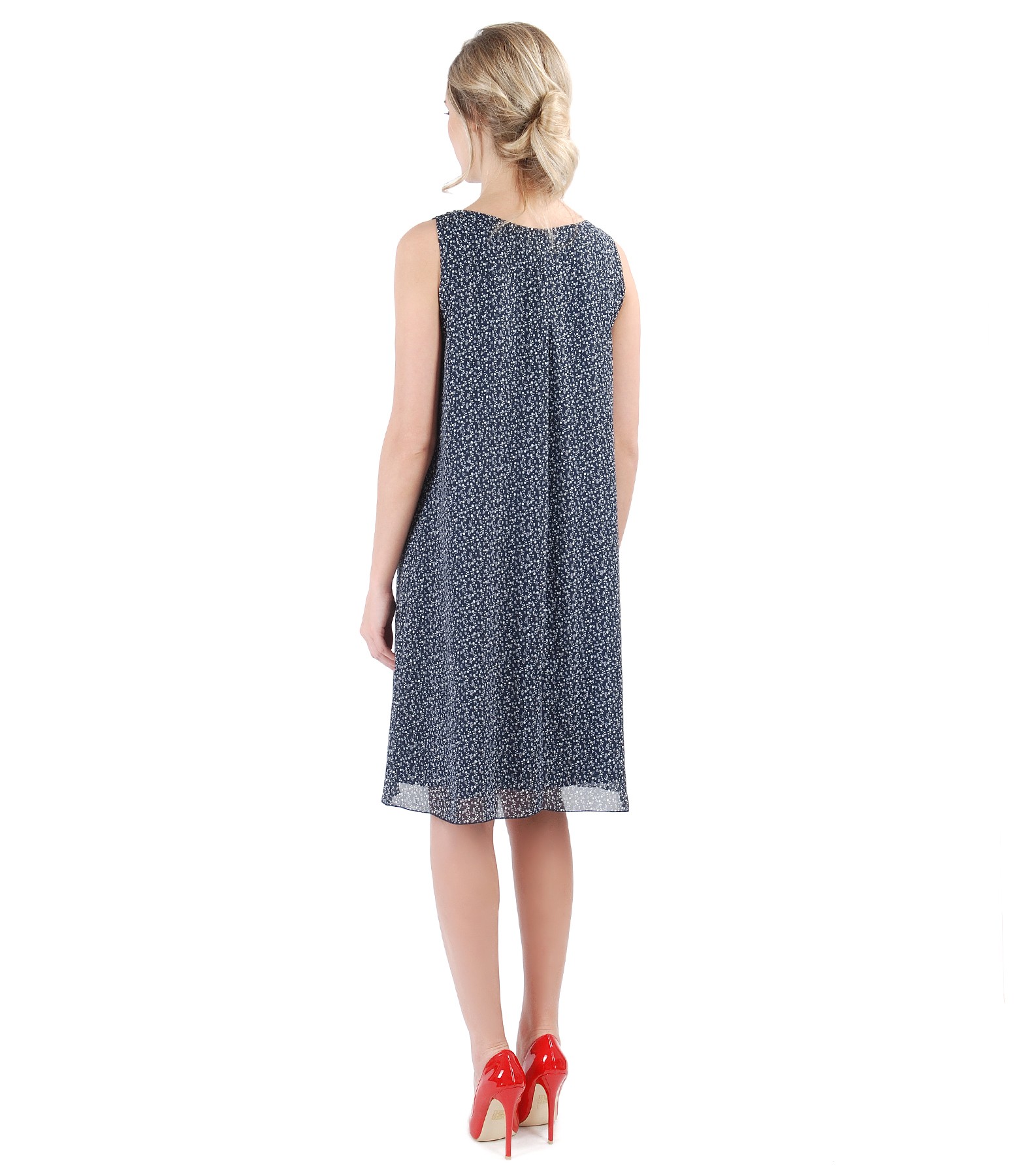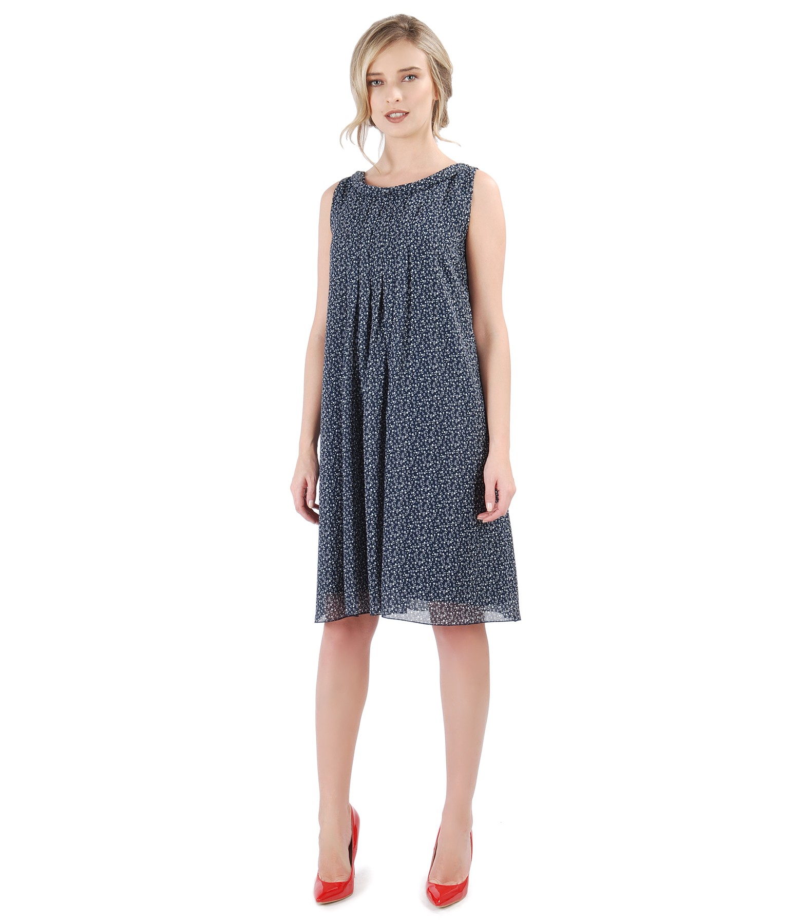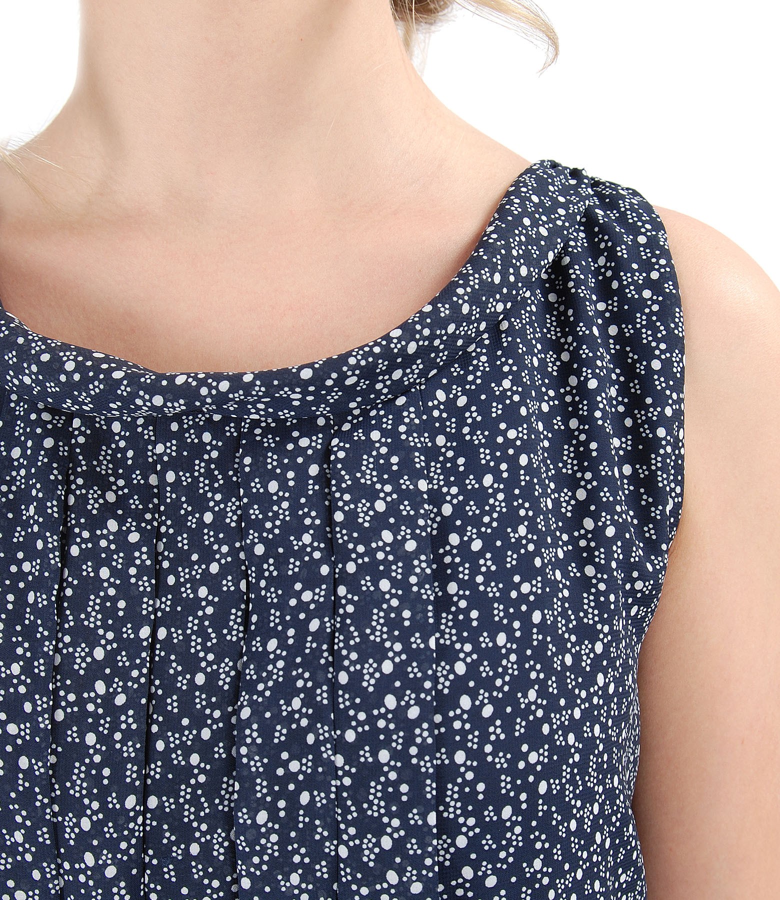 Rochie lejera din voal imprimat cu picouri, captusita cu viscoza, fara maneci, cu falduri pe fata si garnitura pe decolteu. Nu are sistem de inchidere.