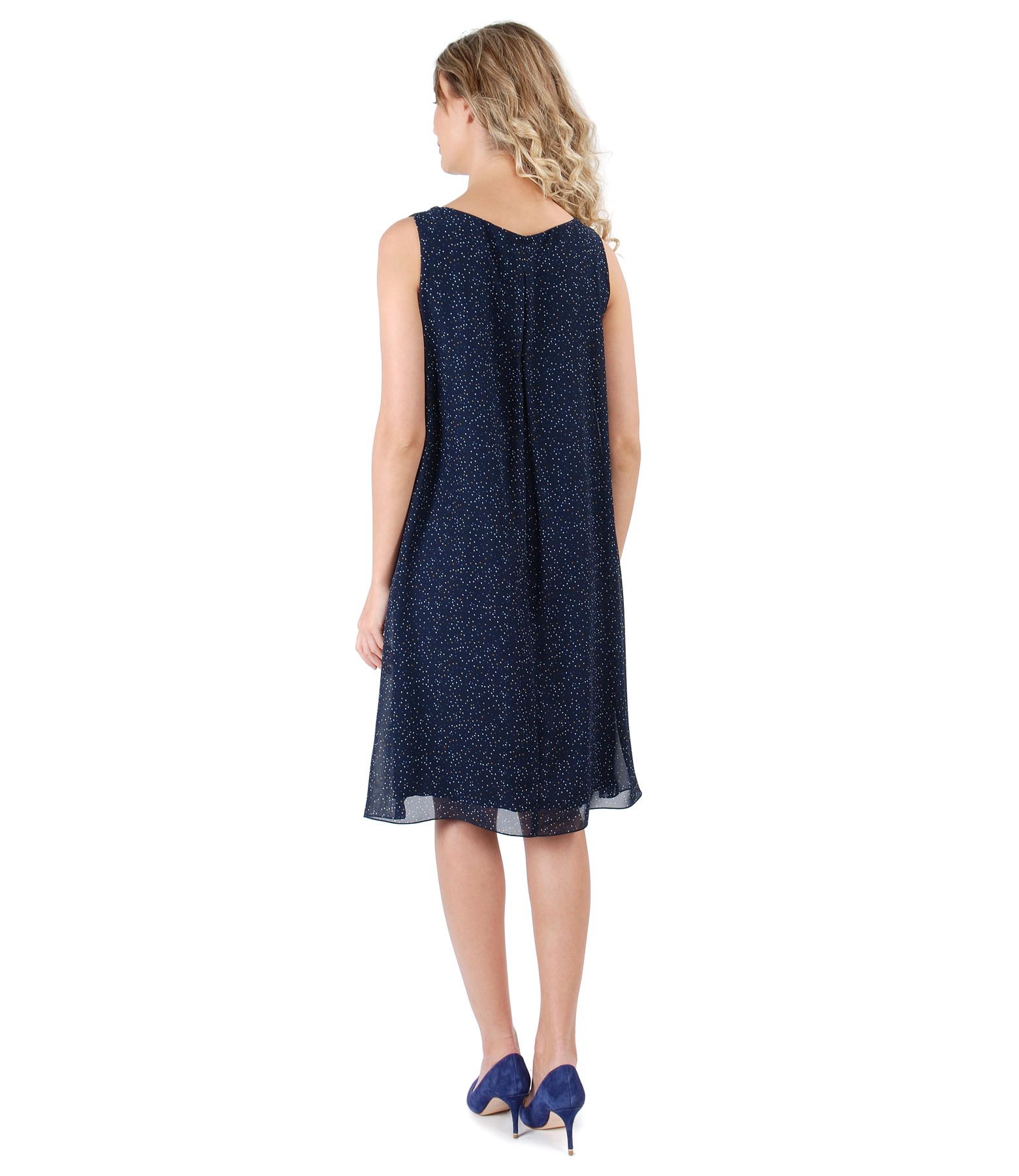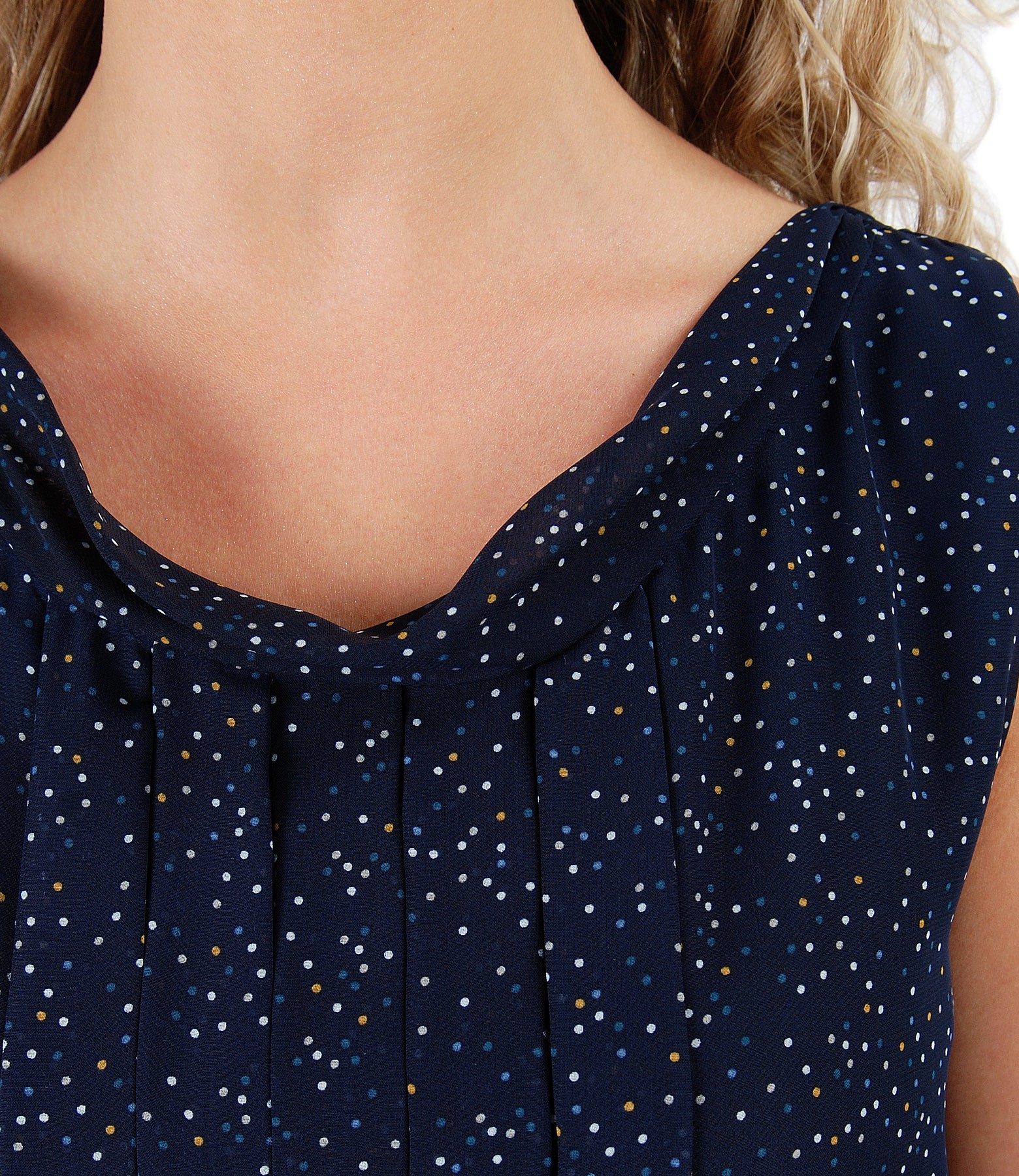 Rochie lejera din voal imprimat cu picouri multi-colore, captusita cu viscoza, fara maneci, cu falduri pe fata si garnitura pe decolteu. Nu are sistem de inchidere.