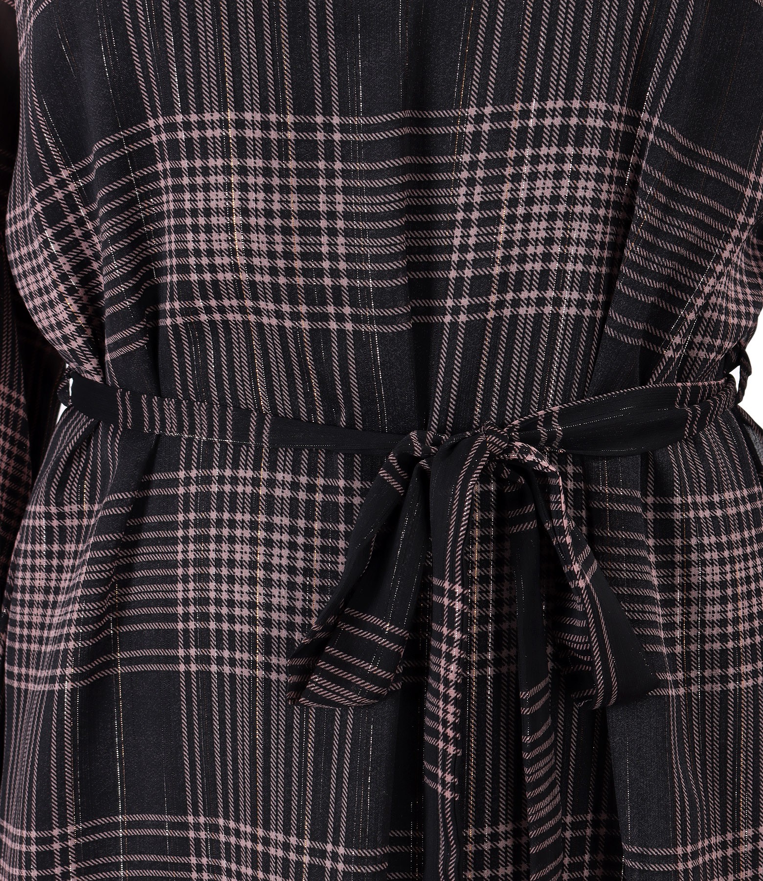 Rochie lejera din voal in carouri cu fir de efect, captusita, cu elastic la decolteu, maneci 3/4 si cordon in talie.