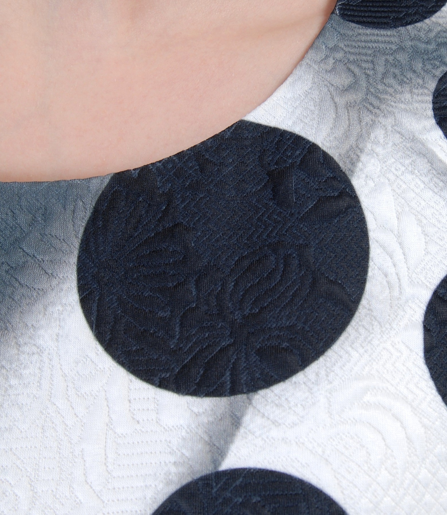 Rochie eleganta imprimata si brocata cu motive florale, elastica, cu decolteu rotund si umeri cazuti, taiata pe mijloc spate. Nu are sistem de inchidere. Pozitia imprimeului difera per produs.