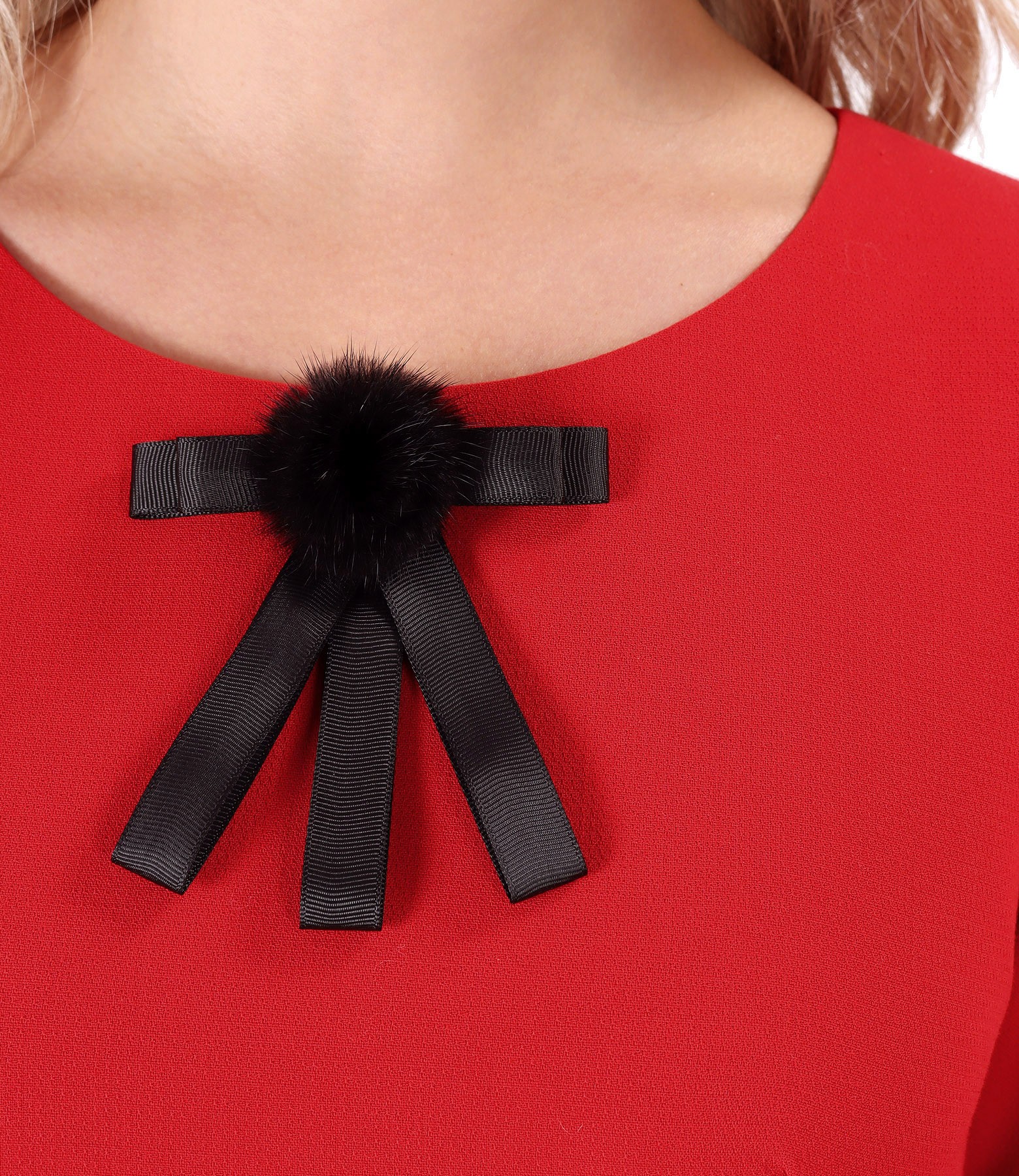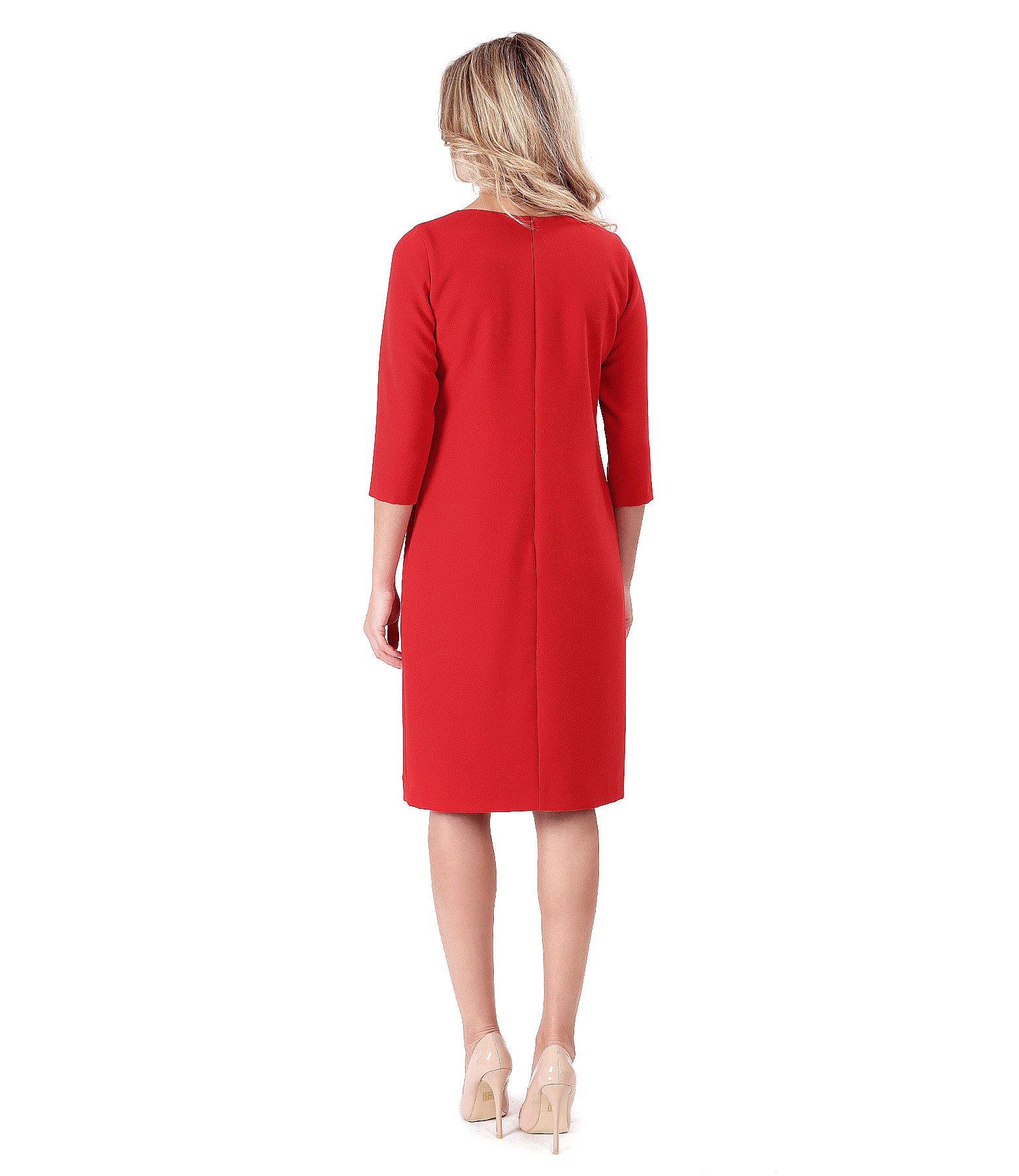 Rochie din stofa elastica rosie, captusita, cu maneci 3/4, decolteu rotund si brosa detasabila la decolteu. Se inchide cu un fermoar ascuns pe mijloc spate.