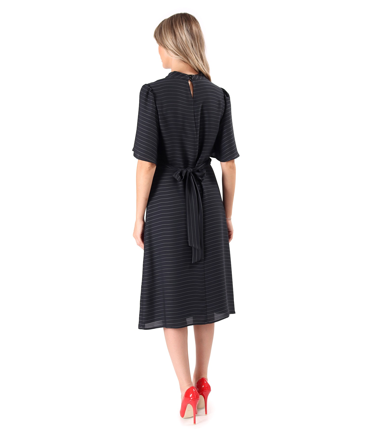 Rochie eleganta cu cordon rasucit in talie, imprimata cu dungi, dublata cu viscoza si cu maneci scurte evazate. Se inchide cu doi nasturi pe mijloc spate.