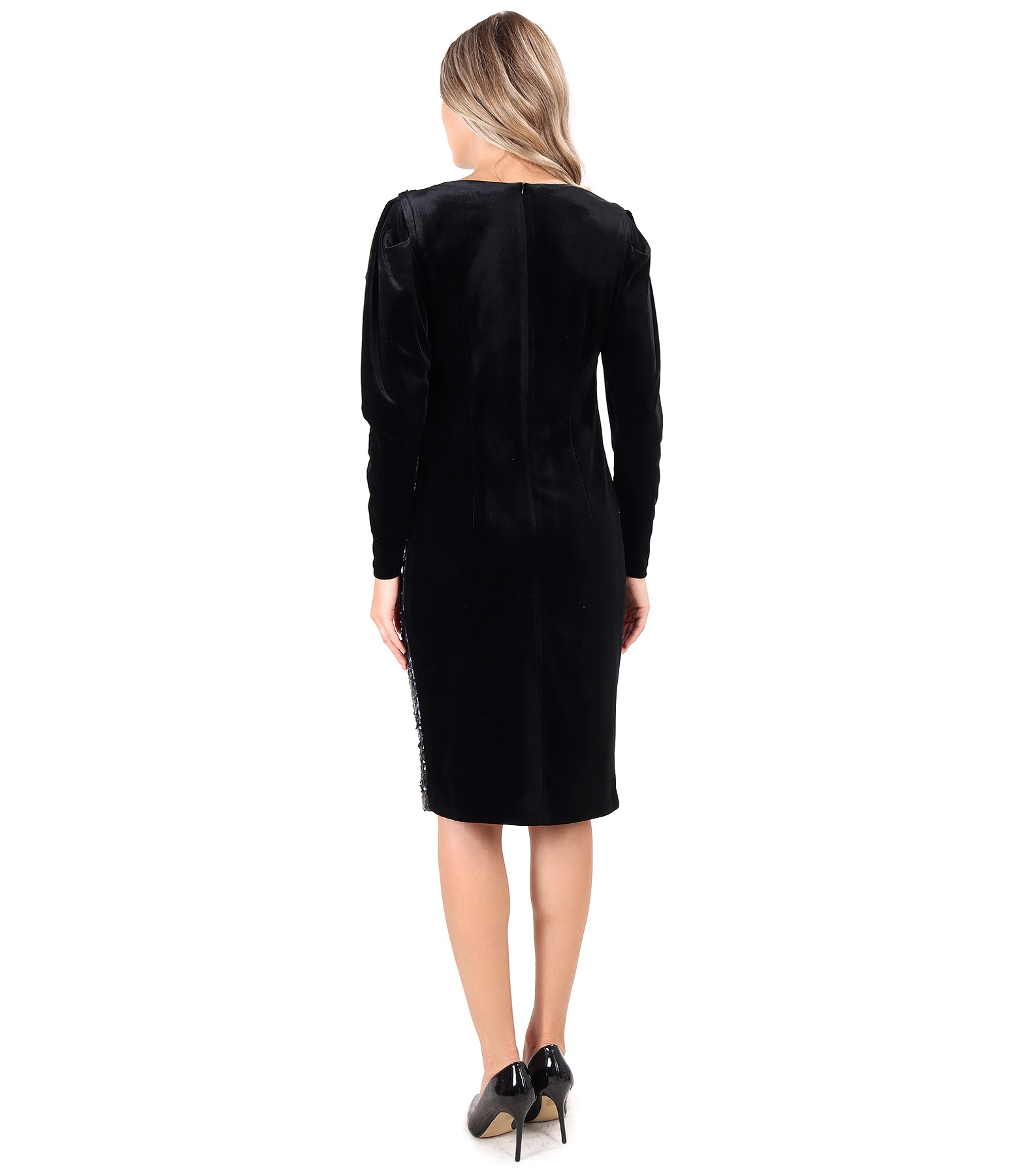 Rochie eleganta cu fata din paiete multicolore si spatele din catifea elastica neagra, cu maneci lungi incretite la umeri din catifea si decolteu rotund. Se inchide cu fermoar ascuns pe mijloc spate.