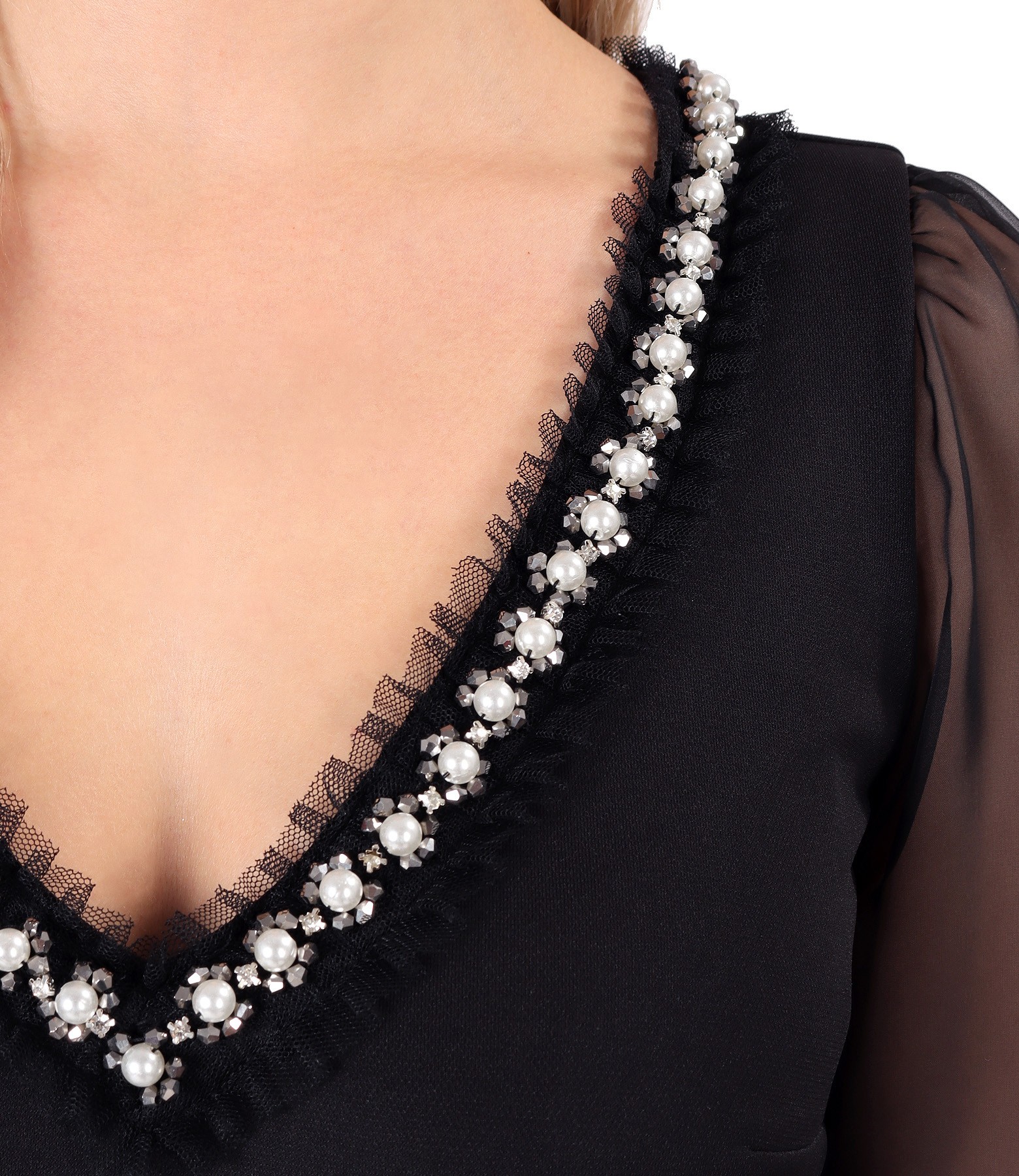 Rochie eleganta, captusita, cu maneci lungi din voal incretite la terminatie, cu decolteu adanc in V si pasmanterie cu perle la decolteu. Se inchide cu fermoar ascuns pe mijloc spate.