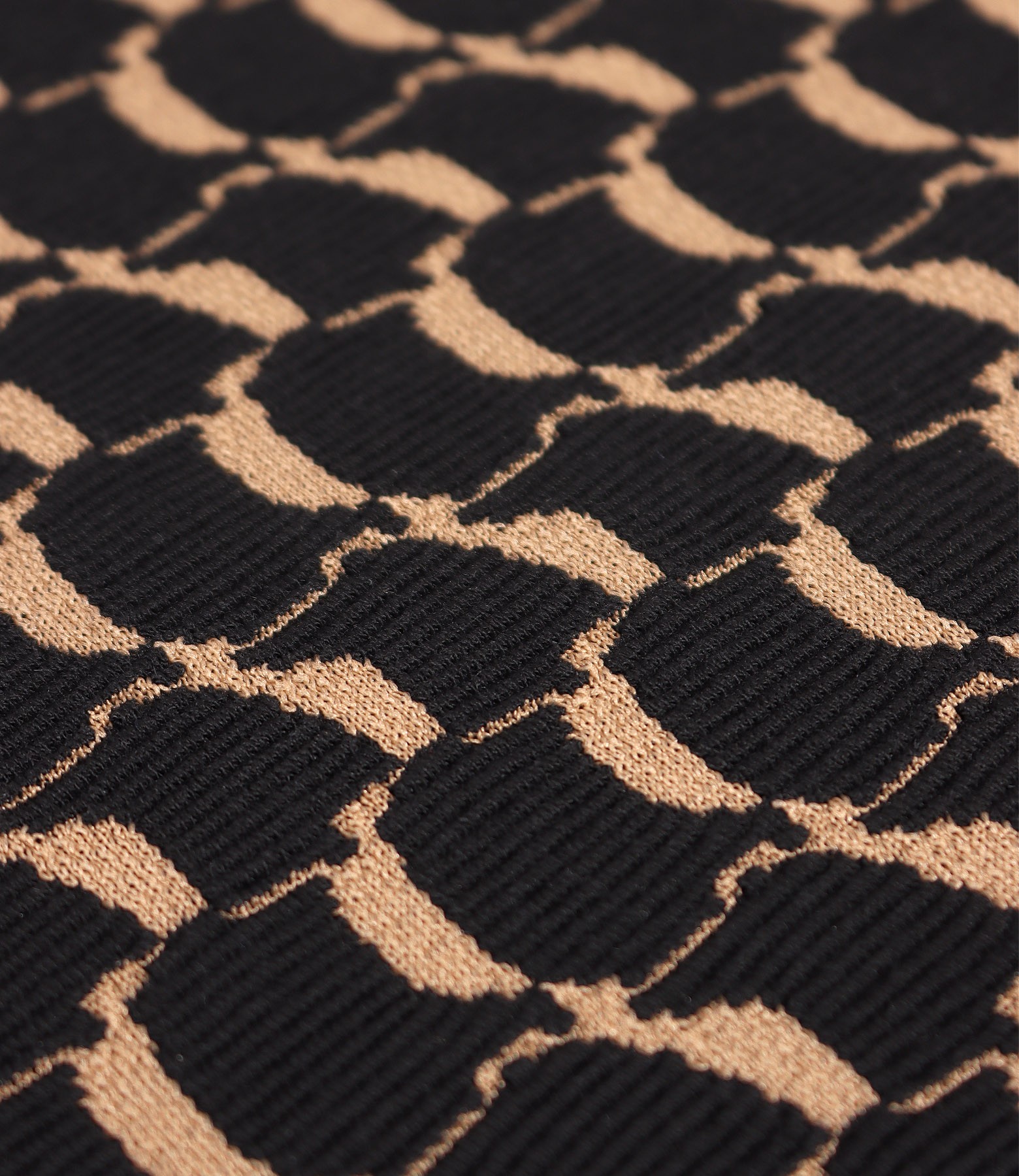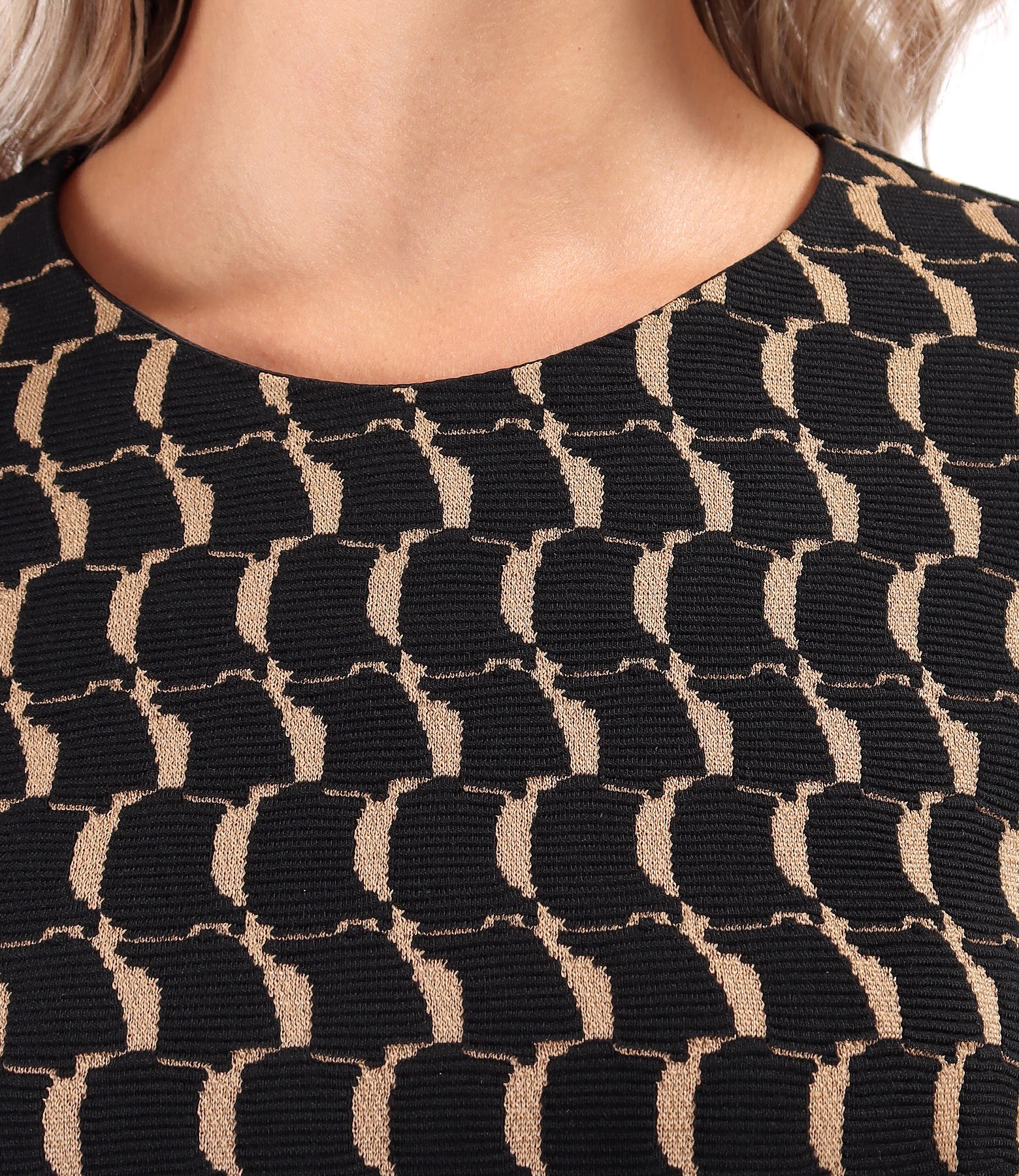 Rochie eleganta din stofa elastica cu viscoza cu motive geometrice, cu maneci lungi si cu decolteu rotund. Se inchide cu fermoar ascuns pe mijloc spate.