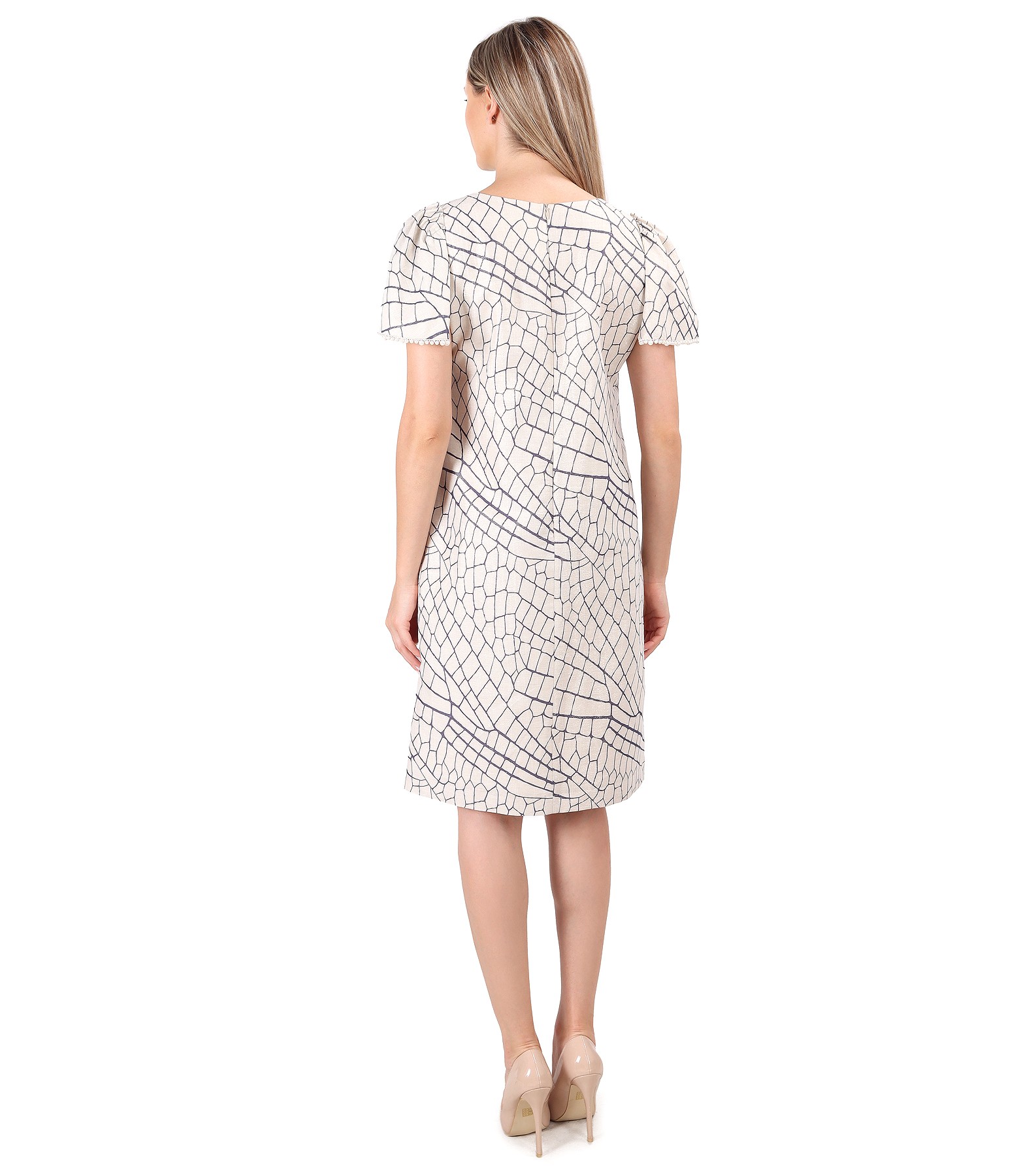Rochie eleganta din bumbac cu in si fir metalic, cu irizatii aurii, dublata cu viscoza, cu maneci scurte, ample, cu perle la terminatii. Se inchide cu fermoar ascuns pe mijloc spate.
