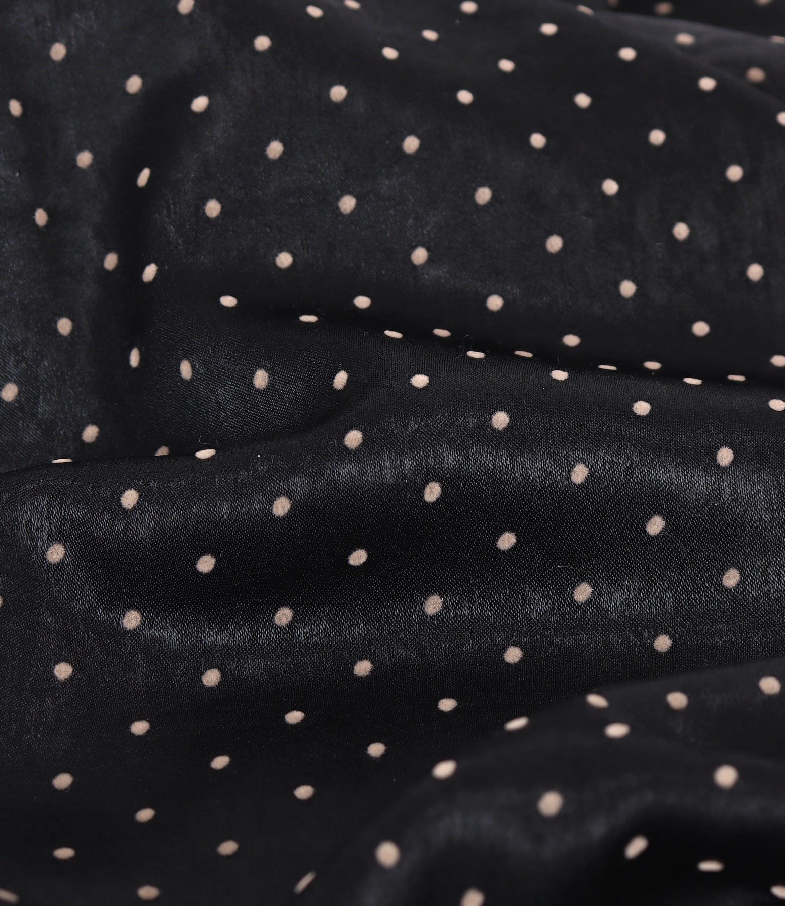 Rochie neagra eleganta cu picouri din catifea bej in relief, dublata cu viscoza, cu maneci scurte si cu brosa detasabila la decolteu. Se inchide cu un nasture si cu fermoar pe mijloc spate.