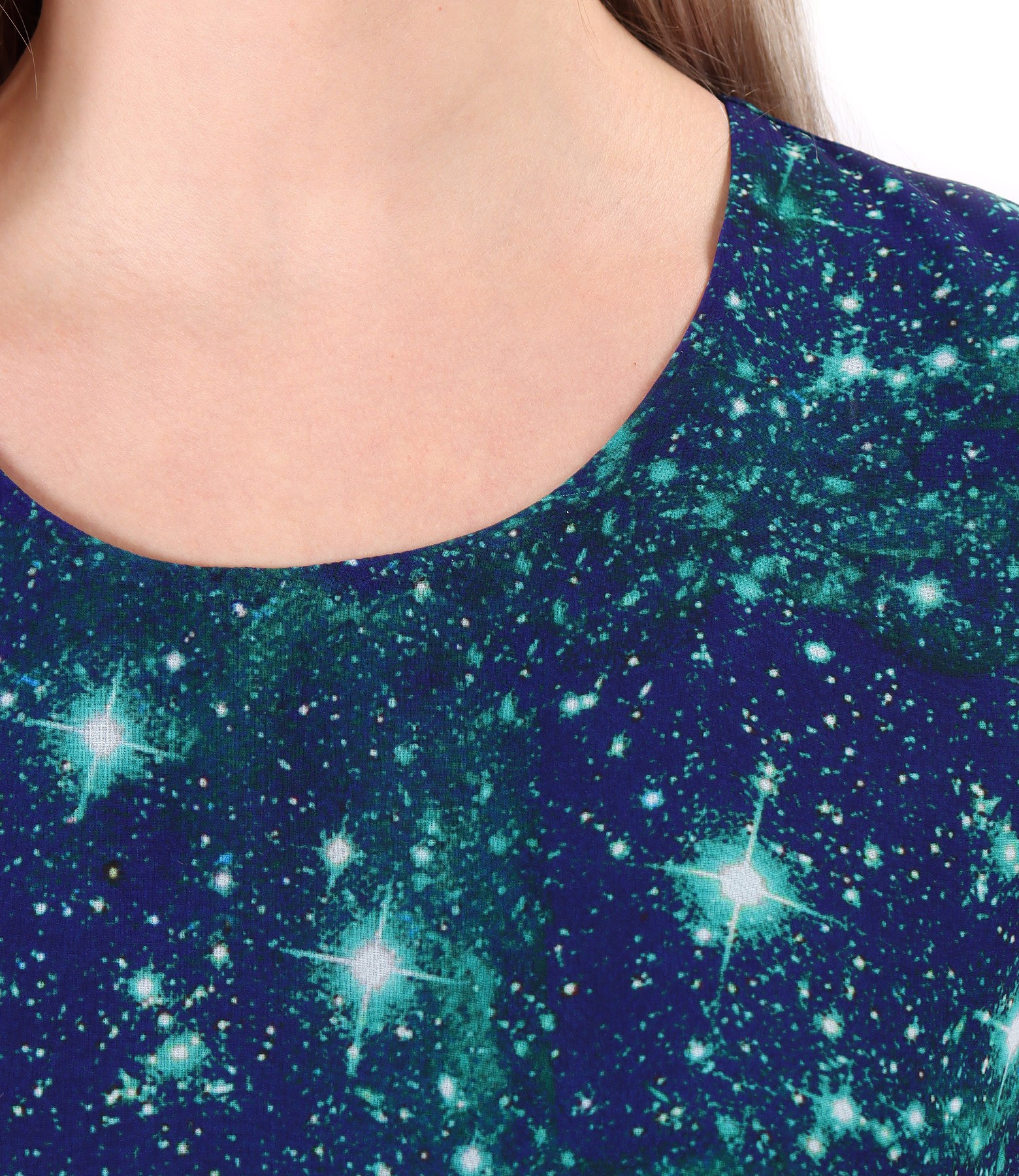Rochie eleganta cu volane din voal imprimat, dublata cu viscoza, cu maneci 3/4 si decolteu rotund. Nu are sistem de inchidere.