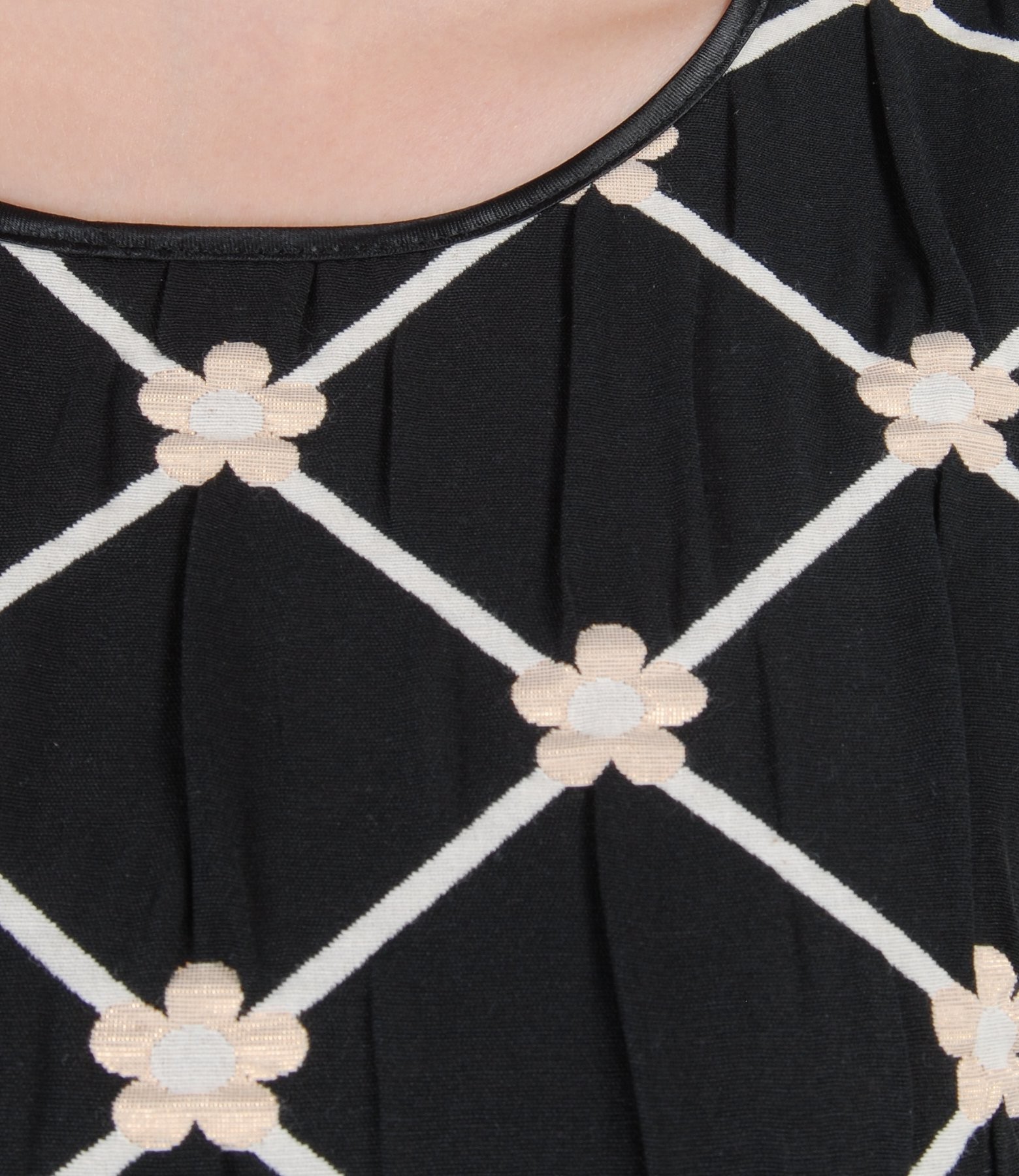 Rochie din brocart elastic multi-color cu fir metalic auriu, cu imprimeu exclusiv, lejera si comfortabila, cu decolteu rotund si maneci cazute. Se inchide cu fermoar ascuns pe lateral stanga.