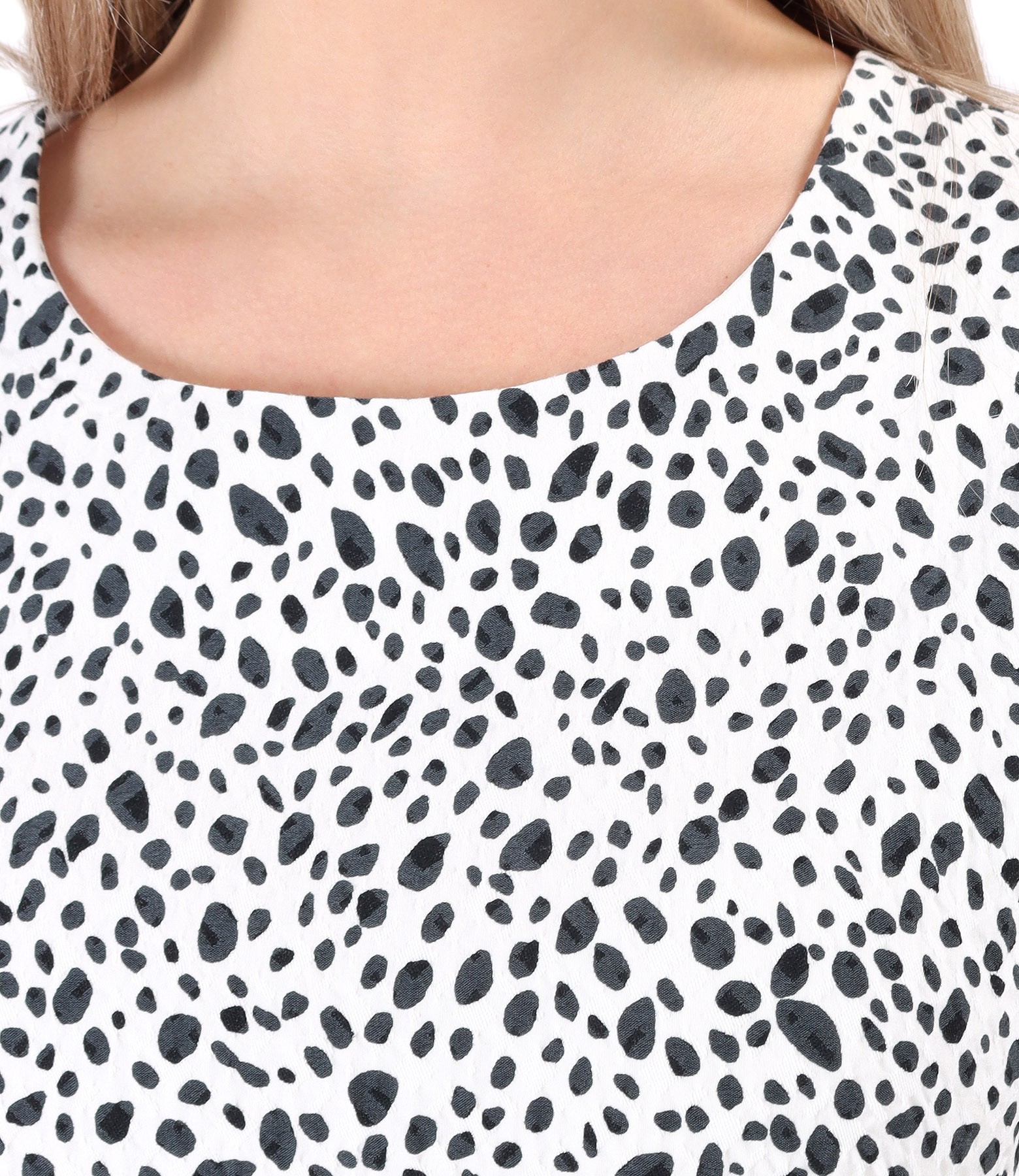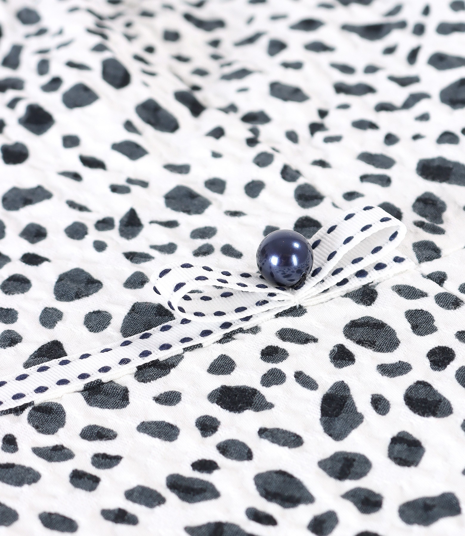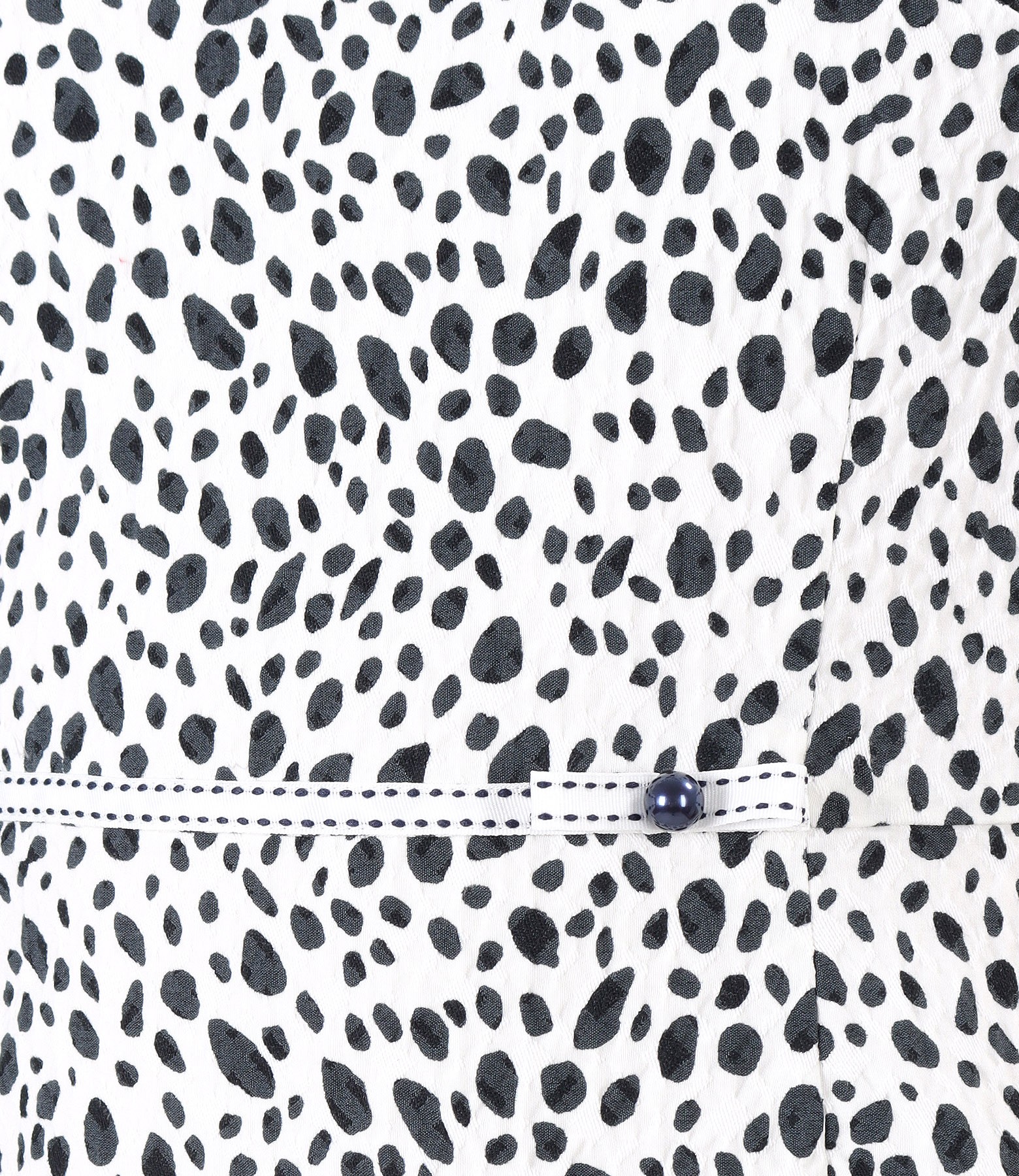 Rochie eleganta din brocart elastic de viscoza imprimată si decorata cu banda de rips si funda cu perla în talie. Este necaptusita, fara maneci, decolteu rotund, se inchide cu fermoar ascuns pe mijloc spate. Se intretine usor prin spalare la masina si nu necesita calcare.