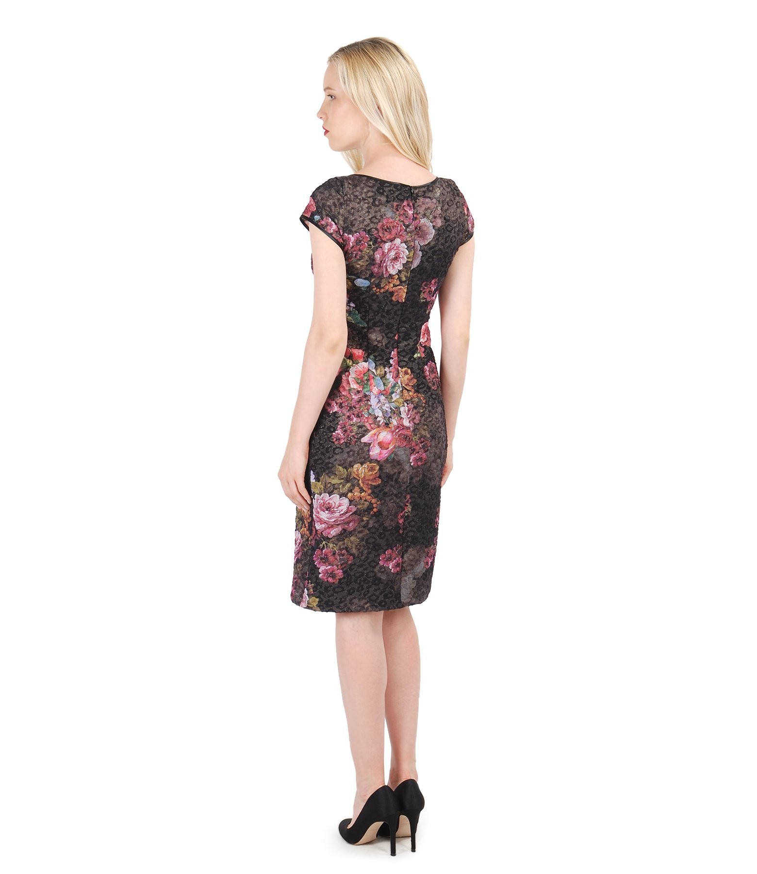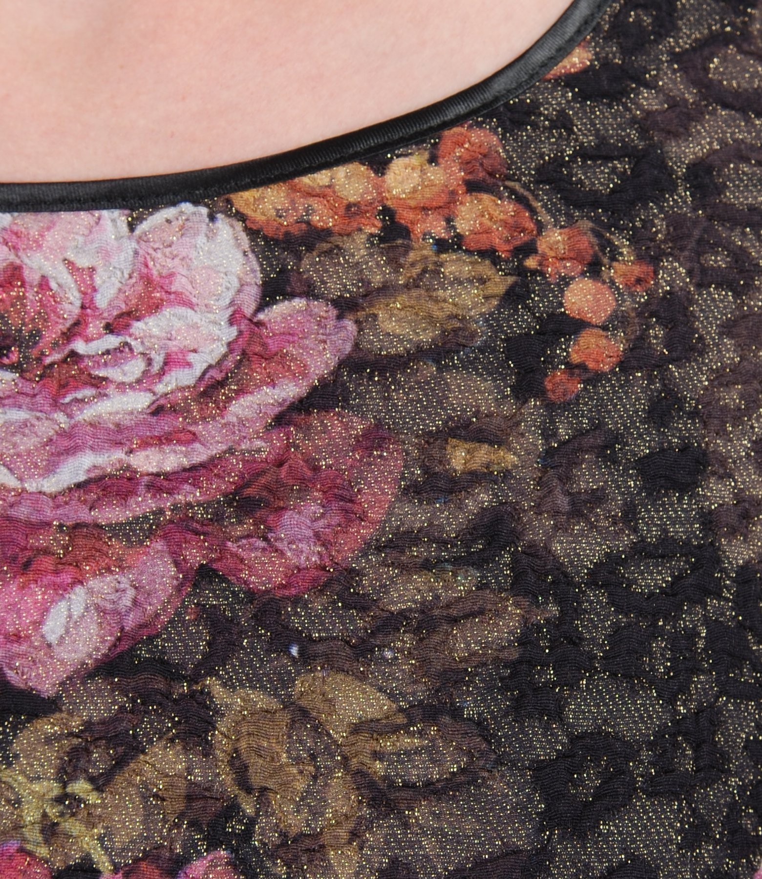 Rochie din brocart elastic multi-color cu fir metalic auriu, cu imprimeu digital exclusiv, lejera si comfortabila, cu decolteu rotund si maneci scurte. Se inchide cu fermoar ascuns pe mijloc spate.