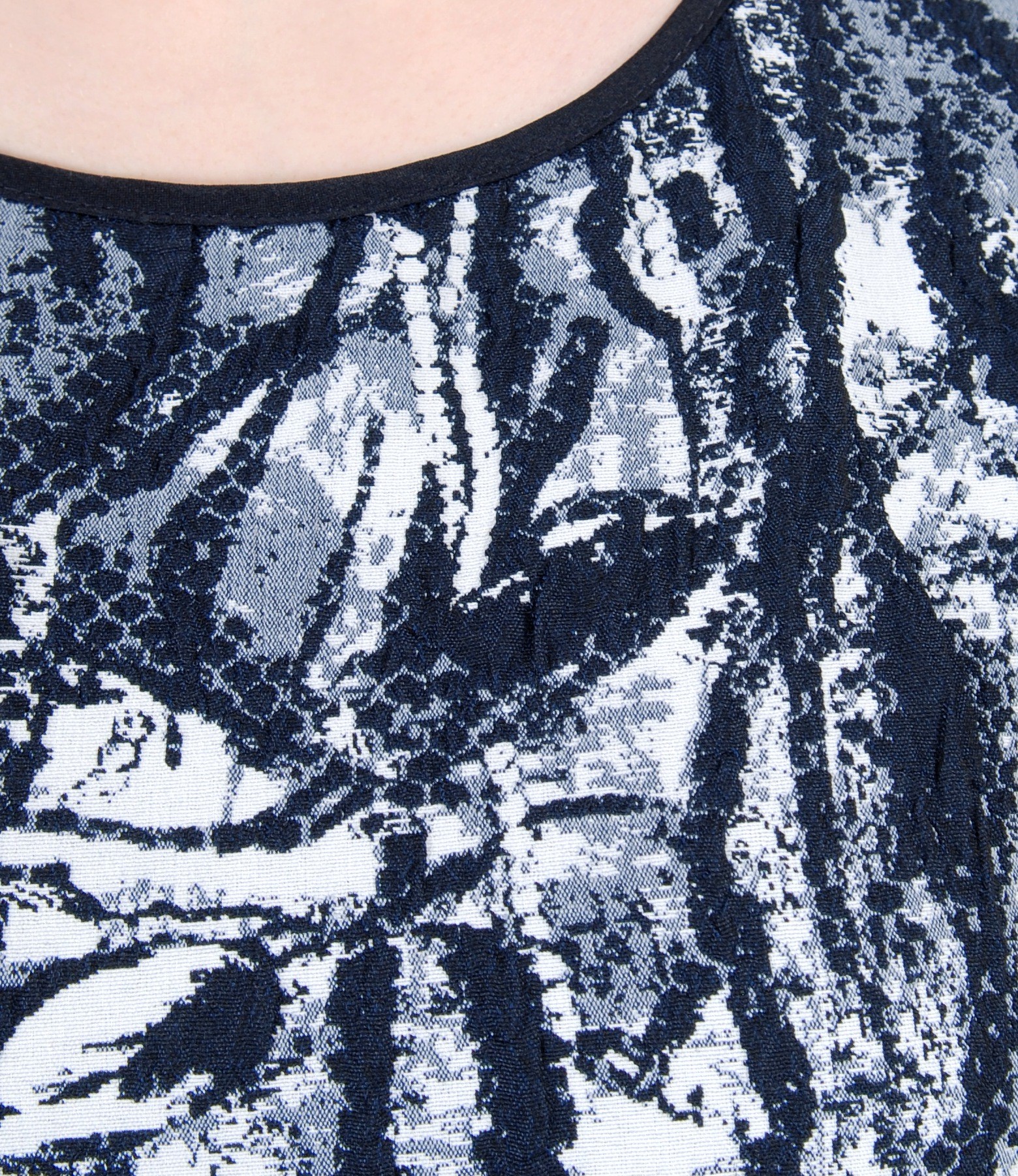 Rochie necaptusita din brocart elastic multi-color, lejera si comfortabila, cu decolteu rotund si umeri cazuti. Se inchide cu fermoar ascuns pe mijloc spate.