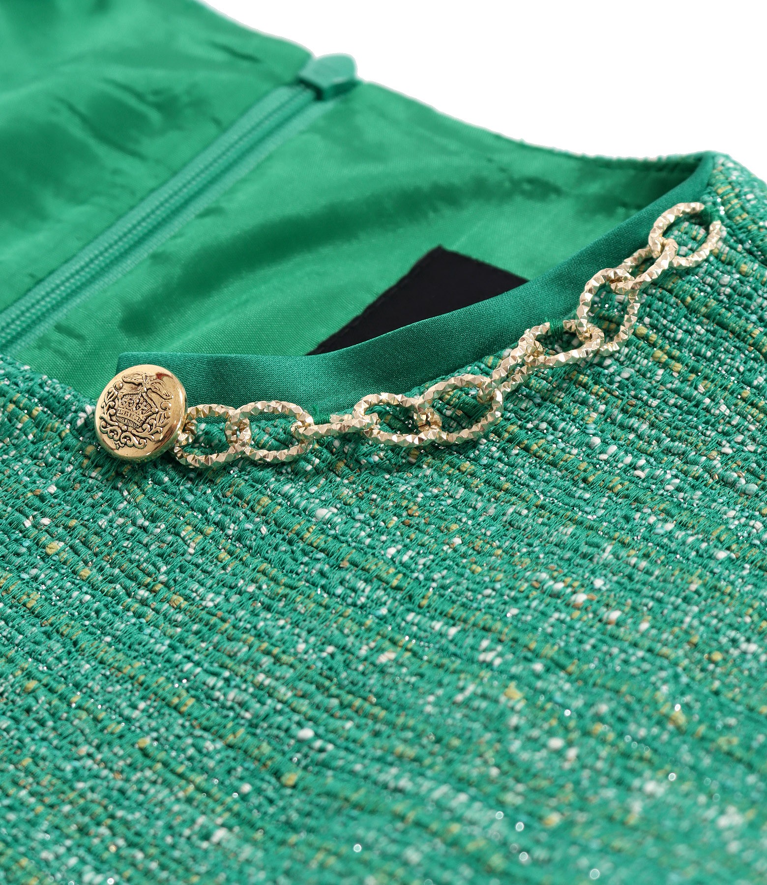 Rochie eleganta din bucle de bumbac cu fir de efect, cu maneci scurte, tip aripioara, cu guler rotund cu banda din saten si lant decorativ auriu, si cu franjuri la terminatie. Se inchide cu un fermoar pe mijloc spate.