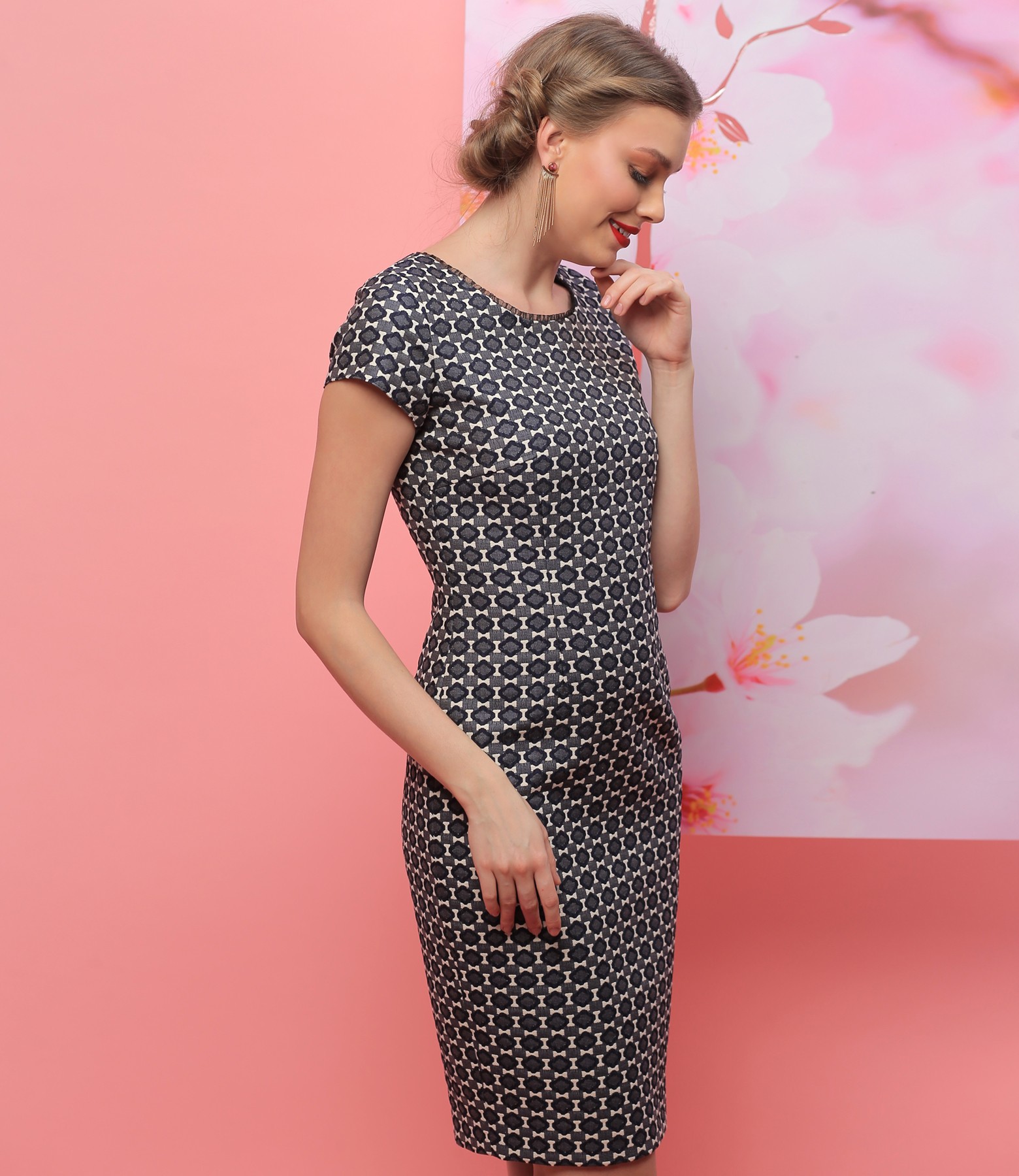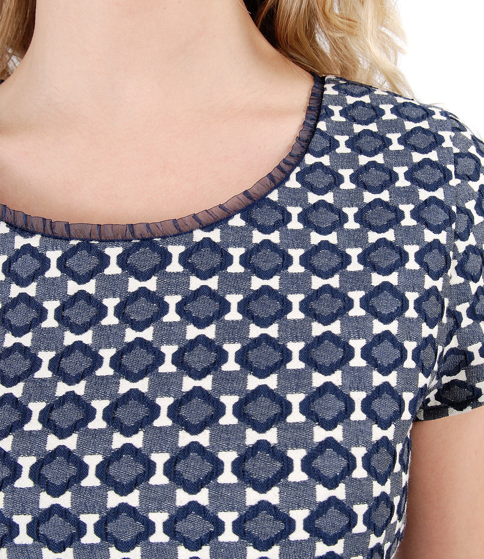 Rochie eleganta din bumbac elastic gofrat, necaptusita, maneci scurte, decolteu rotund si cu dantela aplicata pe decolteu. Se inchide cu fermoar ascuns pe mijloc spate.