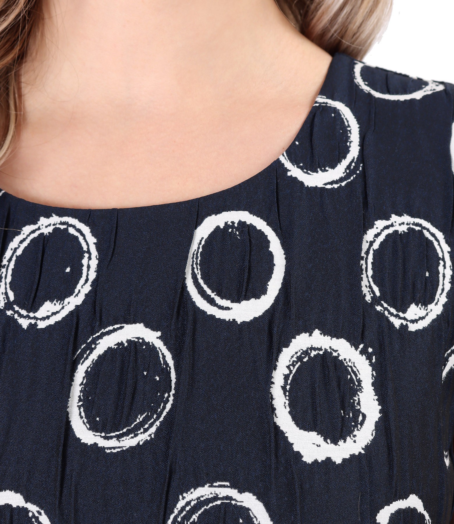 Rochie eleganta cu bumbac elastic gofrat, necaptusita, maneci scurte si decolteu rotund. Se inchide cu fermoar ascuns pe mijloc spate. Nu necesita calcare.