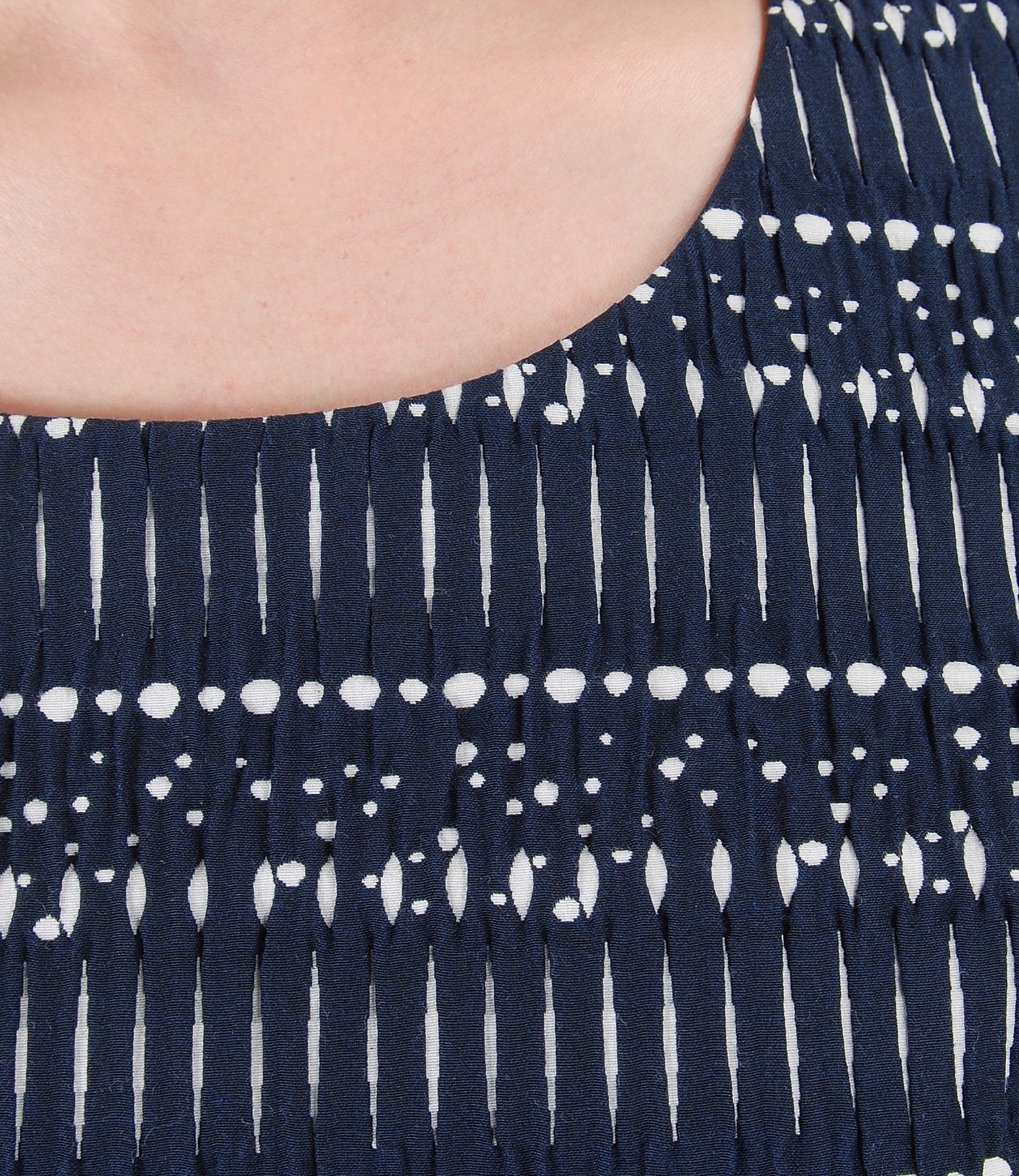 Rochie eleganta din bumbac elastic gofrat, necaptusita, maneci scurte si decolteu rotund. Se inchide cu fermoar ascuns pe mijloc spate.