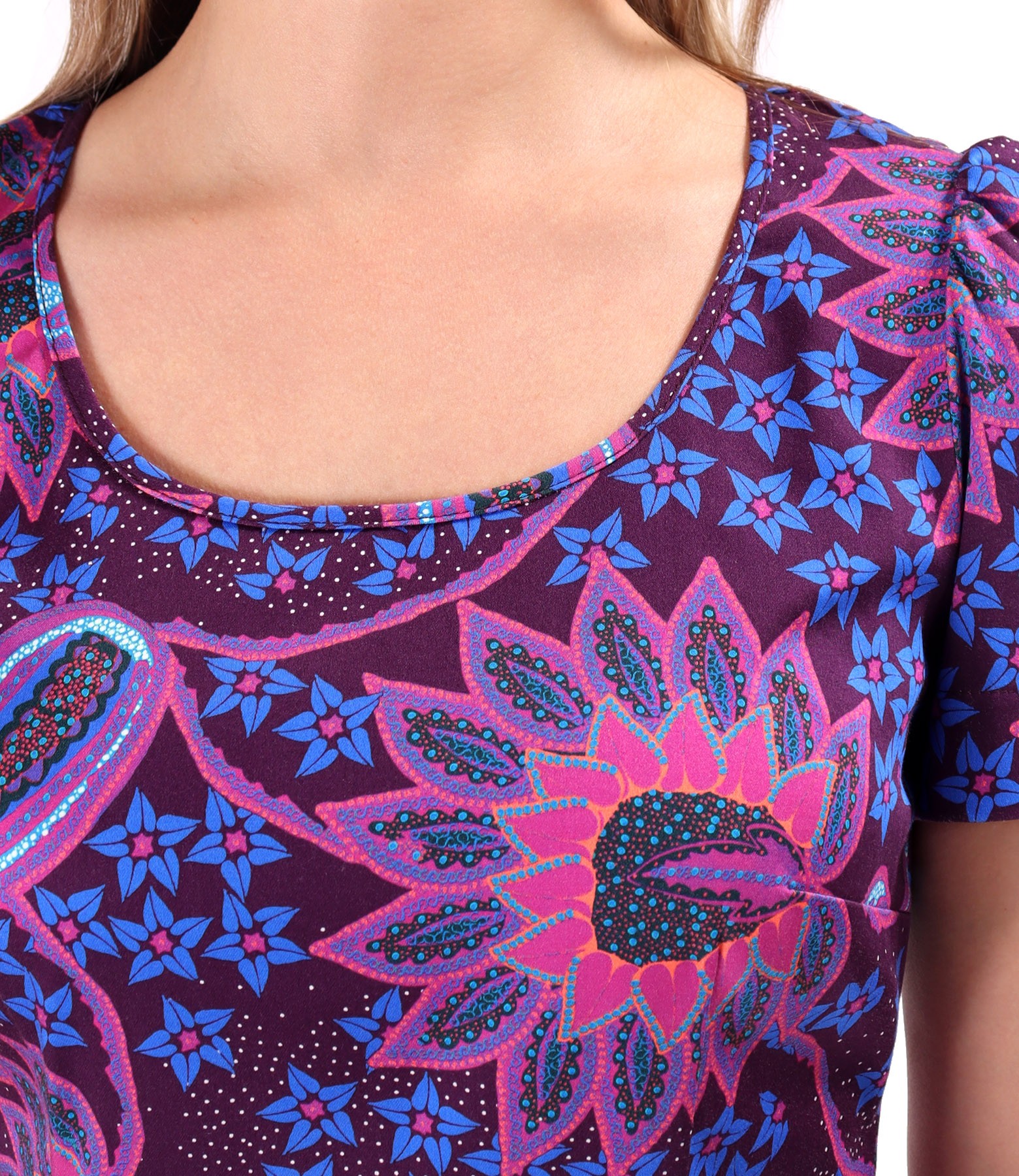 Rochie eleganta din bumbac elastic imprimat digital cu motive paisley, cu decolteu rotund, maneci scurte si slit petrecut pe mijloc spate. Se inchide cu fermoar ascuns pe mijloc spate.