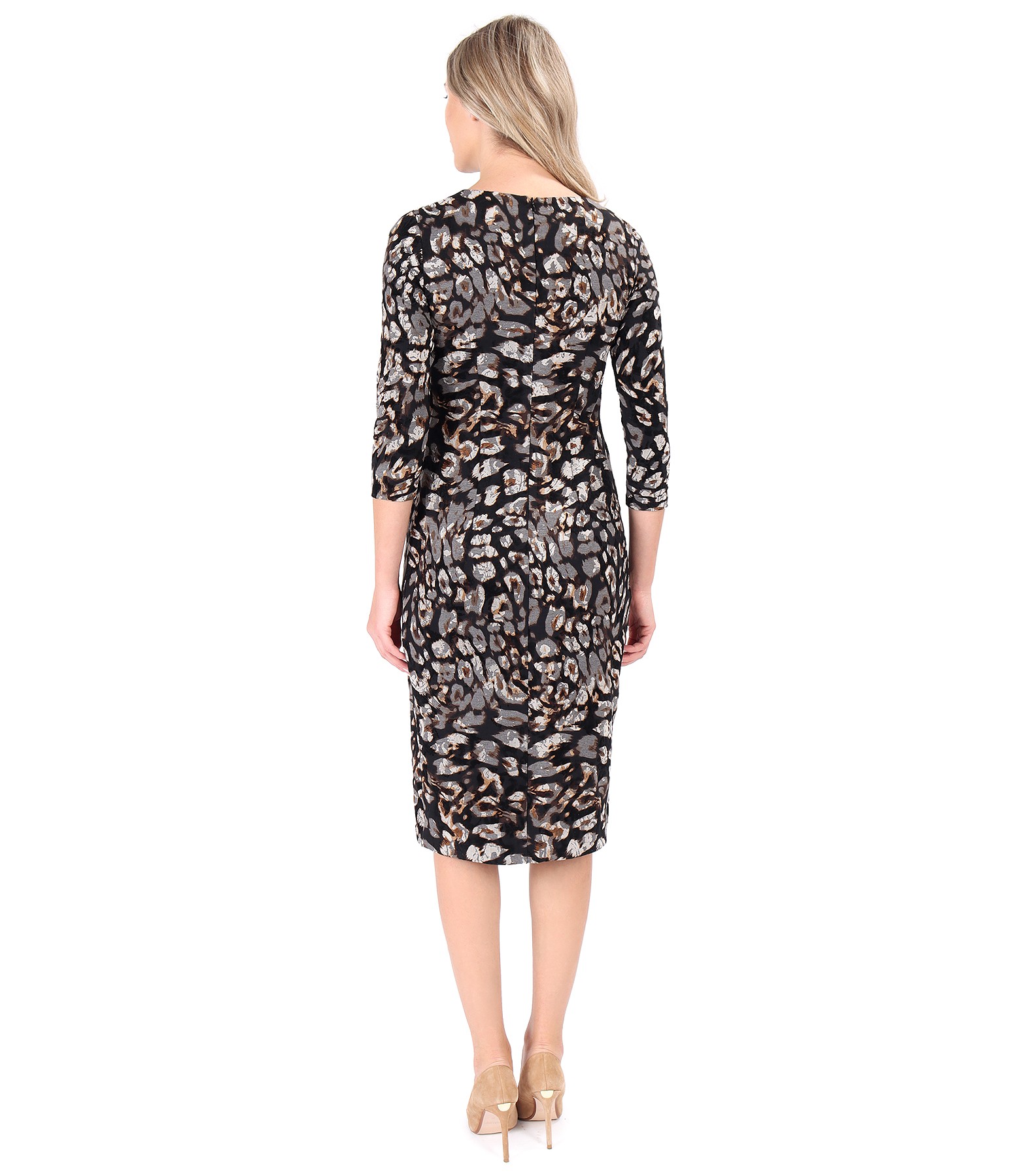 Rochie eleganta din catifea brocata, necaptusita, decolteu rotund, maneci 3/4 si buzunare laterale. Se inchide cu fermoar ascuns pe mijloc spate.